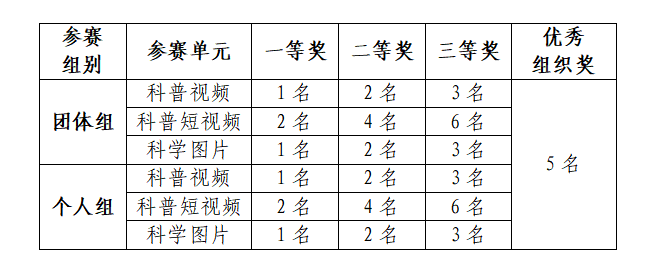 主办方将成立专家评审团,对所有参赛作品进行评审,评选出优秀获奖作品(包括科普视频、科普短视频、科学图片),一、二、三等奖分别给予奖金和证书奖励,其中一等奖奖励1000元,二等奖500元,三等奖300元。对递交参赛作品多且质量高的单位授予优秀组织奖。