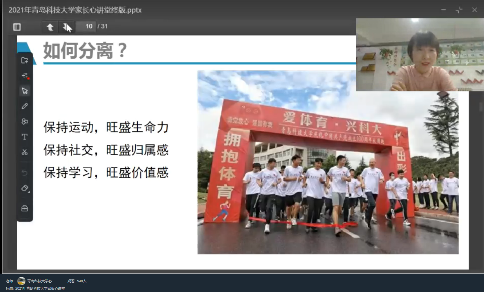 2021级新生入学之际,学校开展了一场别开生面的“家长心讲堂——如何陪伴新生适应”,大学生心理健康教育与咨询中心老师主讲,内容涵盖“正确看待亲子分离”“大学生的心理发展任务”“如何助力学生心理发展”等方面,两千余名新生家长线上参与,并积极互动。