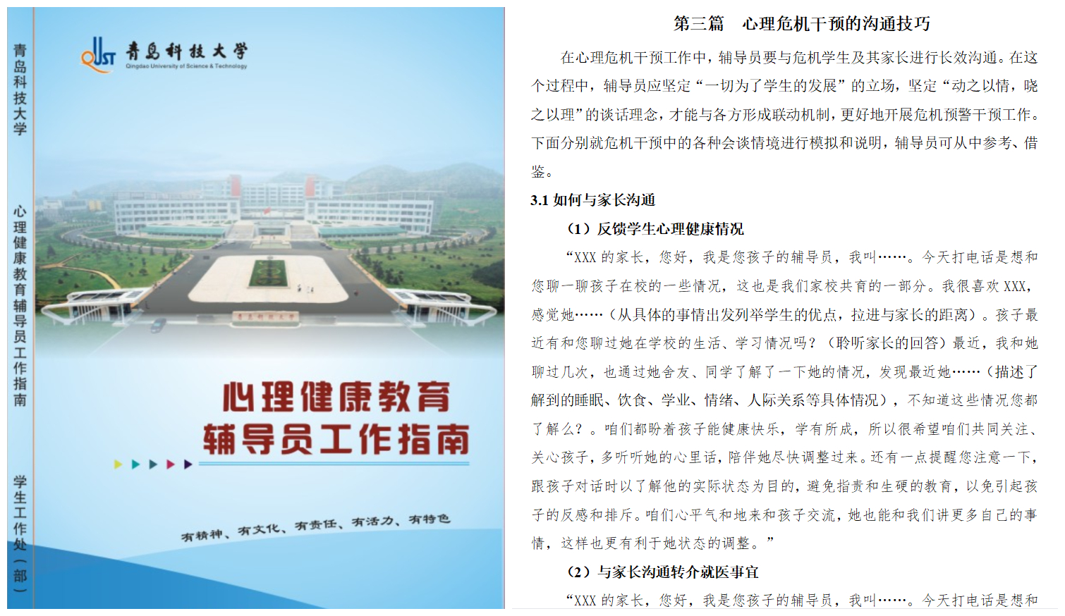 用好心理育人师资队伍,促使家庭成为学生心理健康的“受益人”。学校开设的心理健康教育必修课程采取体验式教学模式,带领学生积极正向表达和沟通,发展自我优势;在提供咨询服务过程中,科学合理地纳入家庭关系,促使学生发生更多与家庭的连接。在面对危机个案时,对家庭开展亲职教育,推动家长转变亲子沟通模式,理解和接纳学生的困境;出版《beat365官方网站辅导员心理工作指南》,为开展温暖有力的家校对话提供具体参考。学校各项举措的制定实施,学生日新月异的变化,都会让家长感受到这个学校的用心用力用情。