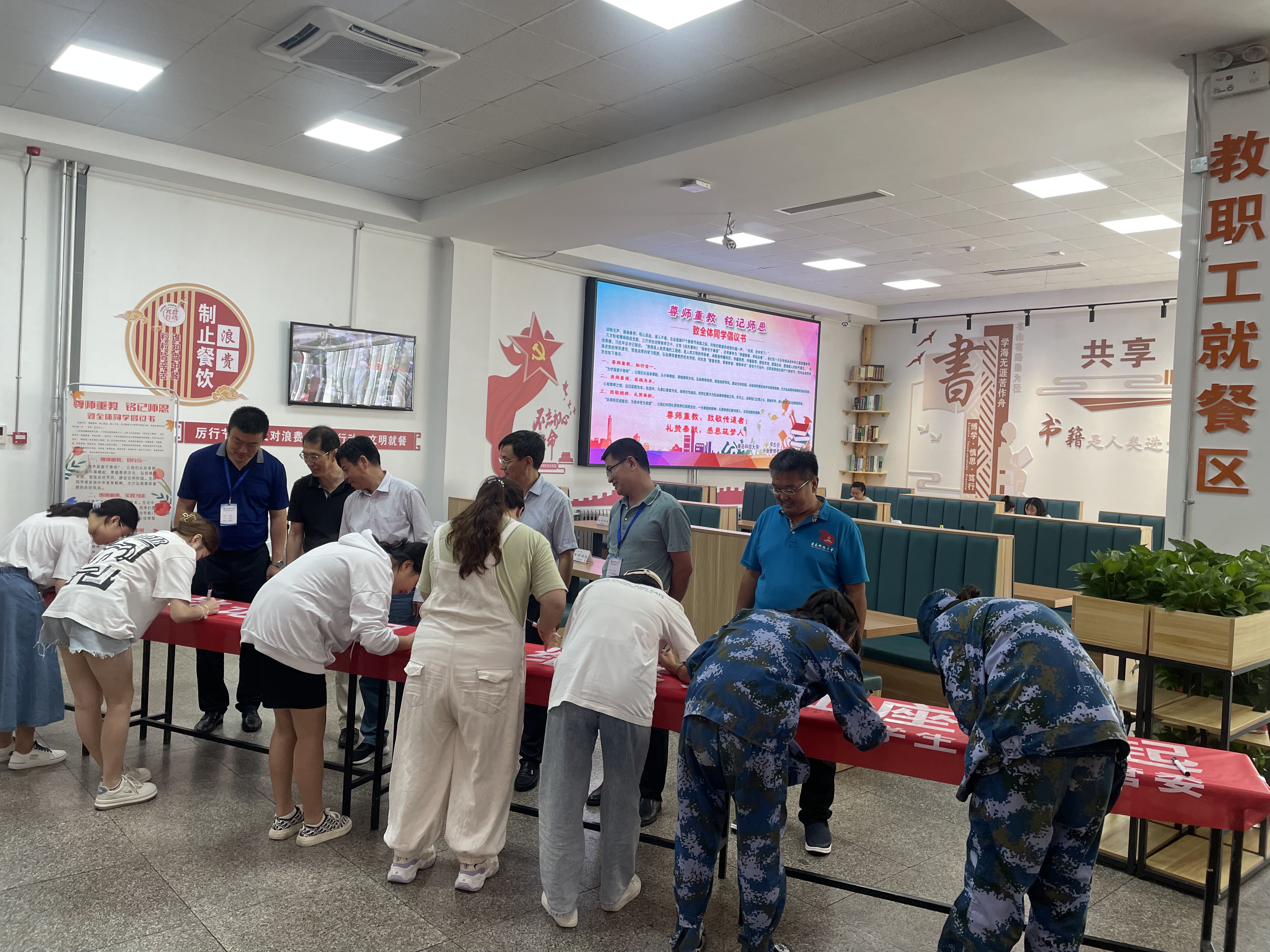 午餐时段陆续前来食堂就餐的学生主动在横幅上签字,纷纷表示将积极响应倡议,从自身做起,大力弘扬尊师重教良好风尚,厚植尊师文化,弘扬尊师传统。通过活动倡导学生将“尊重老师,尊崇学者,尊敬学术”落实于行动中,是后勤服务工作践行“立德树人、服务育人”、落实“我为师生办事实”的一项有力举措,以实际行动推动党史学习教育走实、走深。