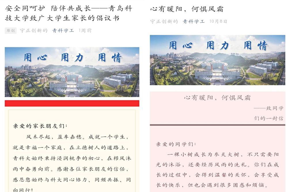 发布《关于进一步加强学生安全和心理健康教育的工作方案》。《方案》坚持以人为本、遵循规律,坚持教育引导、预防为主,坚持统一领导、分级负责,结合学校心理健康教育工作,将“六个一”扩充为“八个一”,明确时间表、路线图,及时部署开展学生心理健康普测筛查和心理健康宣传教育,为各学院(校区)落地落细落实上级学生安全稳定工作要求提供了遵循和指导。发布《安全同呵护陪伴共成长——beat365官方网站致广大学生家长的倡议书》《心有暖阳、何惧风霜——致全体学生的一封信》、传染病防治系列推文、防诈骗系列推文等,深化网络育人成效。