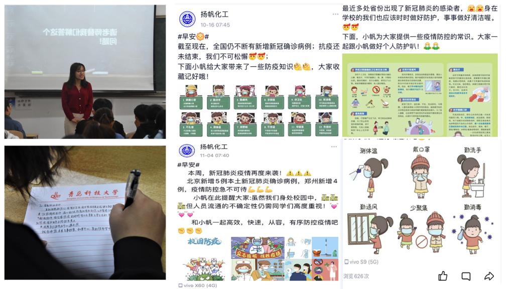用“情”感召,确保宣传引导有“温度”。结合学生特点和需求,开展主题鲜明、内容丰富、受众喜欢的安全和心理健康教育宣讲,让宣传引导有温度、有感召、有实效。在线下,班主任、研究生导师、辅导员用心用情“一对一”开展谈心谈话,深入了解学生的个性特点,精准研判学生学习、生活和成长发展中的困惑、烦恼与迷茫,帮助学生解决困难,化解危机。在线上,学院通过“扬帆化工”和“心晴之声”微信公众号平台持续推送心理健康、生命安全和疫情防控等科普知识,设置“心理篇”“防疫篇”“消防篇”和“防诈篇”等专栏,发布“开学季,你emo吗?”“期中考试即将来临,你紧张吗?”“面对消防安全问题如何紧急处理?”“战‘疫’未停、防控不止”等内容,并针对人际关系紧张、学业困难等典型问题进行专题推送。同时,坚持正面引导与榜样示范相结合,在微信公众号设置“榜样化工”专栏,持续推送成才表率典型、朋辈榜样事迹,将心理与安全教育和榜样教育、感恩教育贯通起来,通过文字、图片和视频等形式展现身边的优秀学子风采,让榜样可见、可寻、可学,以暖心的宣传引导,让育人成效有温度。