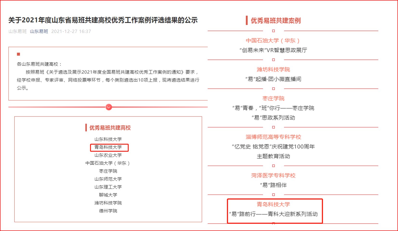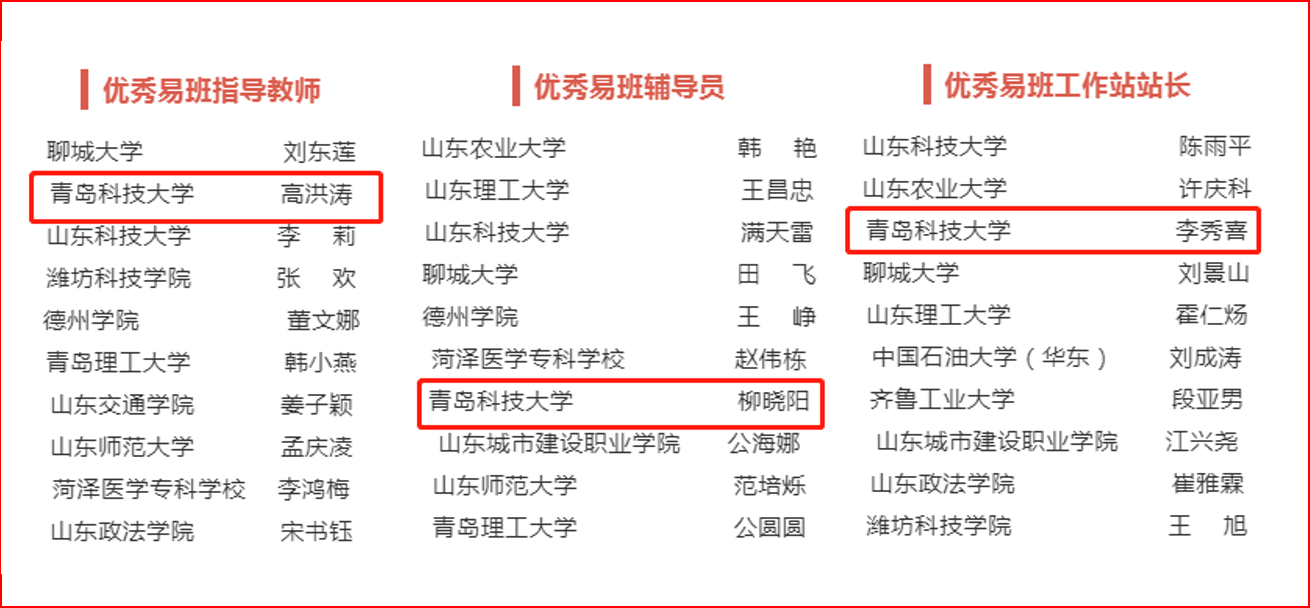 12月27日,山东省易班发展中心2021年度评优工作评选结束。在山东省易班共建高校优秀工作案例评选中,学校被评为“优秀易班共建高校”,“‘易’路前行——青科大迎新系列活动”被评为“优秀易班共建案例”,校易班指导教师高洪涛被评为“优秀易班指导教师”,化工学院柳晓阳被评为“优秀易班辅导员”,校易班工作站站长李秀喜被评为“优秀易班工作站站长”。学校在全部评优工作中均获得表彰,取得了省级易班年度评优优秀成绩。