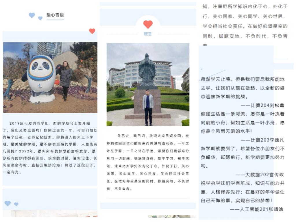 学期伊始新气象,暖心寄语谱新篇。学院各年级辅导员老师与“领航学长”分别对同学们做出诚挚的期望和祝福,希望他们能够在新的学期里坚定自我,不负韶华,心中有梦,踔厉奋发。