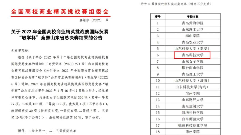 此次竞赛由中国国际贸易促进委员会商业行业分会、中国国际商会商业行业商会、中国商业经济学会和中国会展经济研究会联合主办,是目前我国商科教育领域规模最大的赛事活动,山东省总决赛采用线上团体赛的形式,共有来自全省30所院校的300支队伍、近千余名师生入围总决赛。经竞赛评审委员会评审,共评选出学生组获奖项目一等奖77 项,二等奖107 项,三等奖112项。