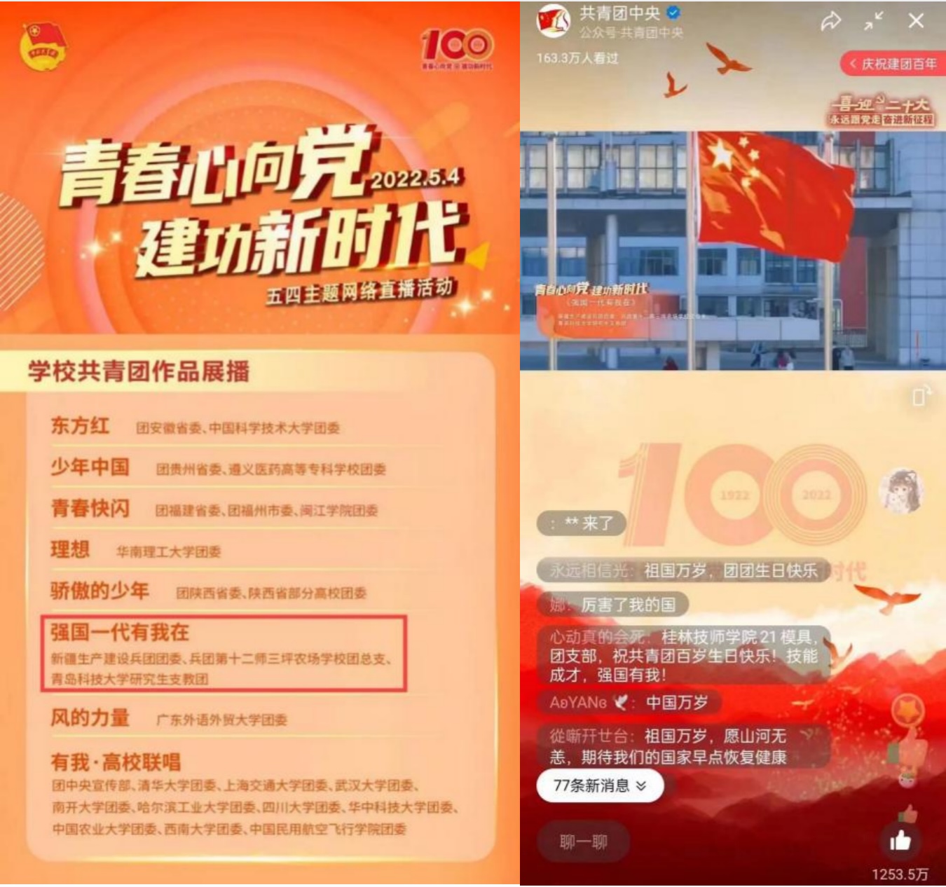 据悉,本次展播作品在微信、微博、学习强国、b站、抖音等多个新媒体平台同步直播,学校作品《强国一代有我在》累计浏览点赞量破千万人次。视频以历届研支团志愿者在学校和服务地隔空同唱《强国一代有我在》的形式,展现了研支团用歌声汇聚滚烫誓言,用奋斗谱写青春和热爱的故事,展示了青科大研支团十年薪火相传、接续奋斗的责任与担当。