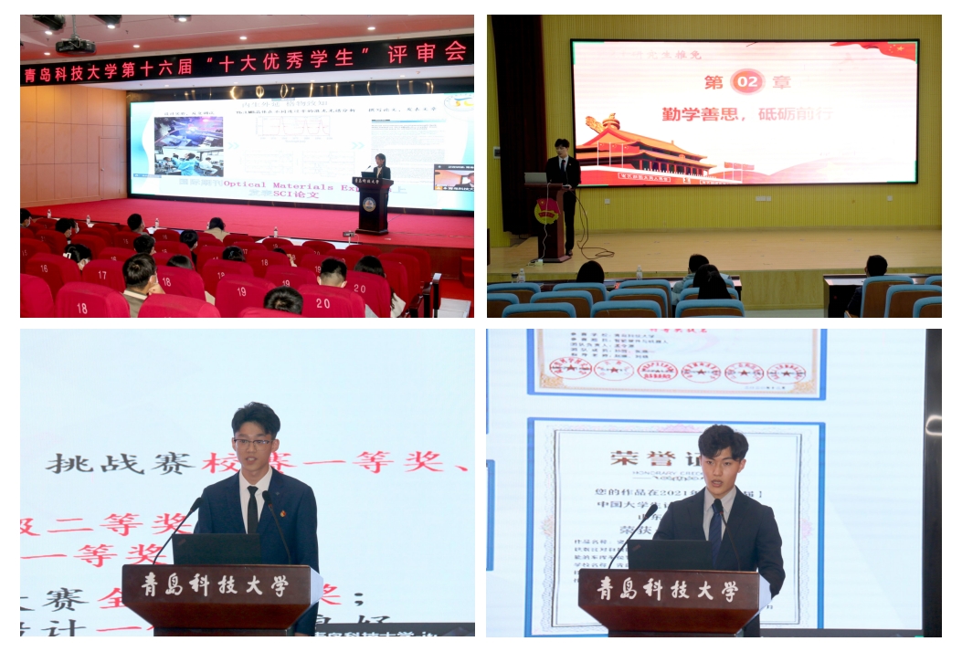 此次“十大优秀学生”现场评审环节采取线上线下相结合的方式进行,主会场设在崂山校区,四方校区、高密校区设分会场,三校区同步线上进行。评审会上,23名候选人紧密结合自身学习、工作实际情况,从学术科研、班团活动、志愿服务、社会实践、创新创业等方面展现了多彩的大学生活与收获,展现了科大学子勇于践行“明德、笃学、弘毅、拓新”的良好精神面貌。各学院(校区)19名教师代表与95名学生代表结合候选人事迹与现场表现进行了评审投票。