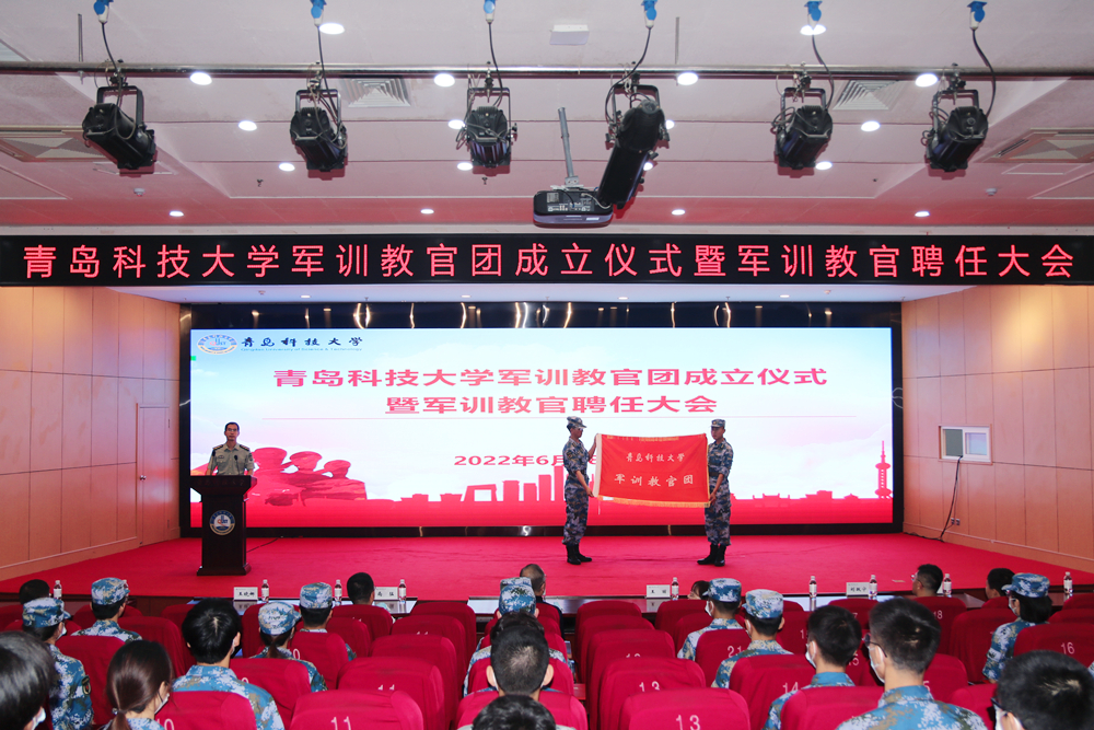 6月28日下午,学校2022级学生军训团成立暨军训教官聘任大会在崂山校区第三报告厅举行。党委常委、副校长丁林出席大会并向军训团授旗。