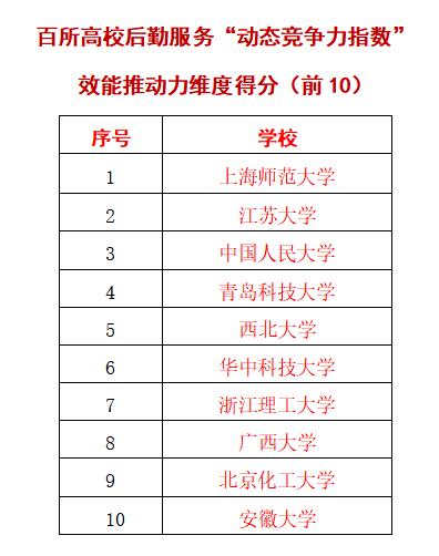日前,中国教育后勤协会发布2021年《百所高校后勤服务“动态竞争力指数”》,beat365官网在“动态竞争力指数”效能推动力维度排行榜上位列第四名。