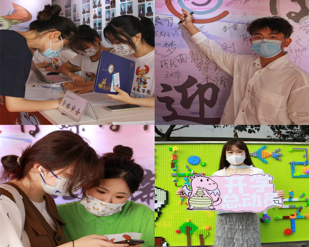为让迎新工作更有特色,更显亮点,传媒学院结合实际,发挥专业优势制定特色迎新方案。学生作品展出长廊及精美动漫视频展播让新生在报到过程中近距离接触所学专业,体验专业特色。用乐高积木拼成的“Hi,新同学”系列展板别具一格,吸引过往同学纷纷驻足打卡。踏上红地毯,完成报到手续,新生们在“热烈欢迎2022级新同学”的签名墙上签上自己的名字,留下期待与梦想。新生专属特色口罩和新生大礼包更是让来自五湖四海的传媒学子归属感倍增。