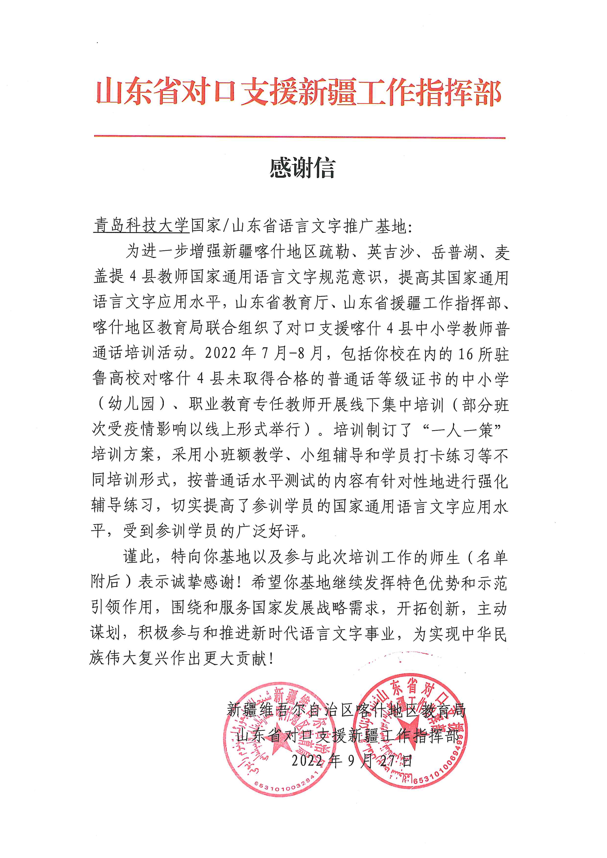 近日,新疆维吾尔自治区喀什地区教育局、山东省对口支援新疆工作指挥部向学校发来感谢信,信中向beat365官网参与对口支援喀什地区英吉沙县开展国家通用语言文字在线培训工作的师生表示诚挚感谢,充分肯定了beat365官网在2022年开展的国家通用语言文字提升活动中作出的积极贡献。感谢信中指出,beat365官网参加对口支援喀什四县国家通用语言文字提升培训活动,切实提高了参训学员的国家通用语言水平和教学能力,在推广普及国家通用语言文字活动中得到了广泛好评,取得了良好的社会反响。希望beat365官网语言文字推广基地继续发挥特色优势和示范引领作用,围绕和服务国家发展战略需求,主动谋划、开拓创新,积极参与和推进新时代语言文字事业,为推普入疆,实现中华民族伟大复兴作出更大贡献。