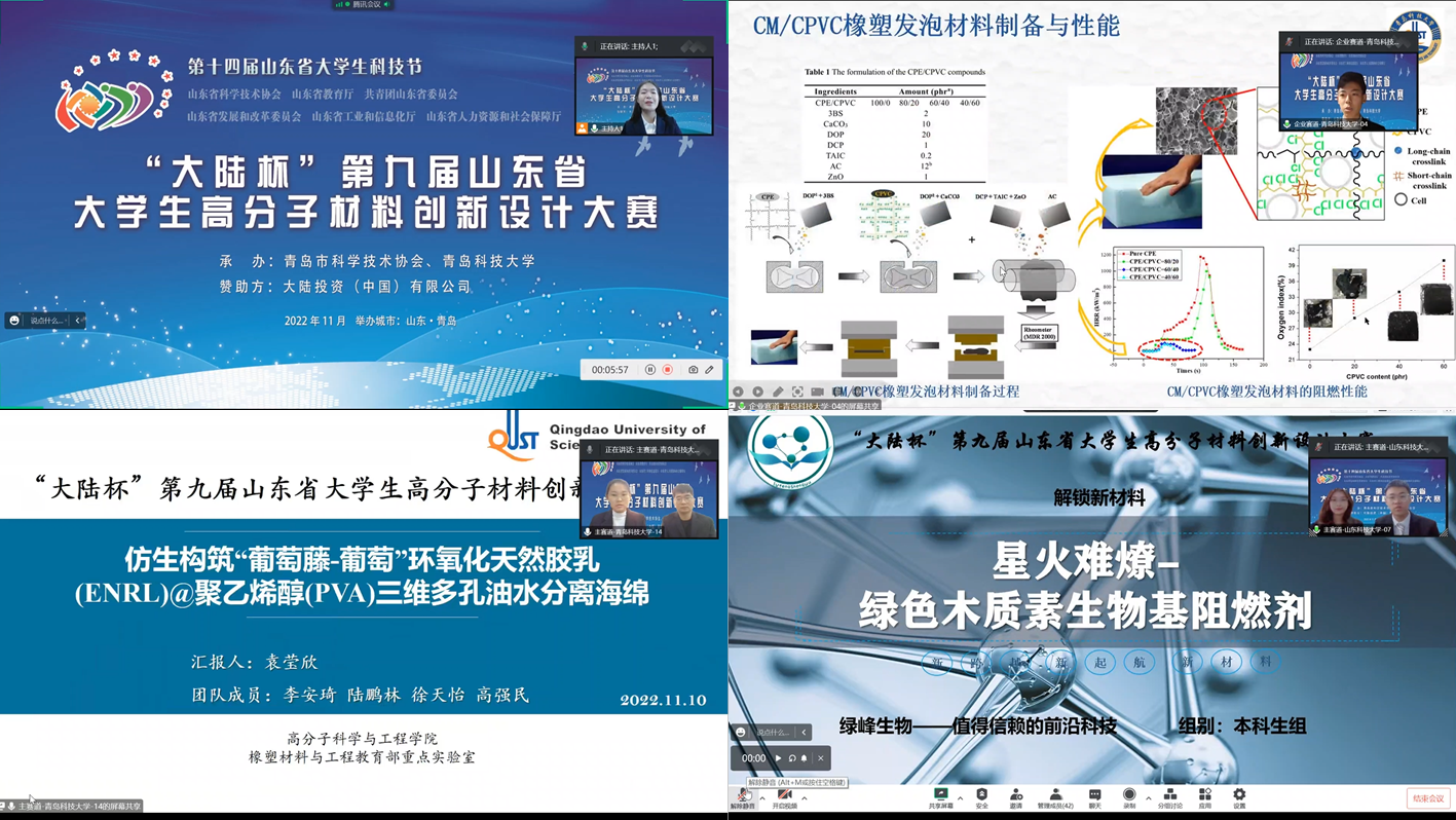 近日,由山东省科协、省教育厅、团省委、省发改委、省工信厅、省人社厅主办,青岛市科协、beat365官方网站承办,大陆投资(中国)有限公司赞助支持的“大陆杯”第九届山东省大学生高分子材料创新设计大赛决赛在beat365官网举行,来自西南大学、武汉工程大学、山东科技大学、beat365官方网站等全国11所高校的33支队伍参加最终决赛,决赛以线上答辩方式举行。