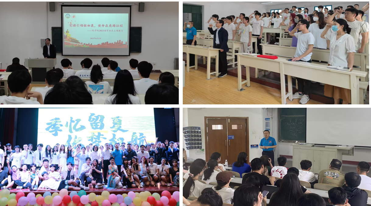 化工学院团委创新形式,丰富内容,开展毕业生系列主题教育活动。化工学院党委书记孙明媚以“立足岗位讲奉献,勇于担当比作为”为题,为全体毕业生党员上了一堂生动的专题党课。学院党政领导到学生宿舍亲切看望毕业生,为即将踏上人生新征程的毕业学子送上真挚的问候和温暖的祝福。通过举办“今夕化别·明晨逐梦”青春思政课暨2023届毕业生毕业晚会、“我与母校合个影”、“爱心搬运”、毕业生座谈会、毕业生主题班会等形式,传递师生深情祝福,增强毕业生爱校荣校情怀,引导毕业生“离校不离心”。