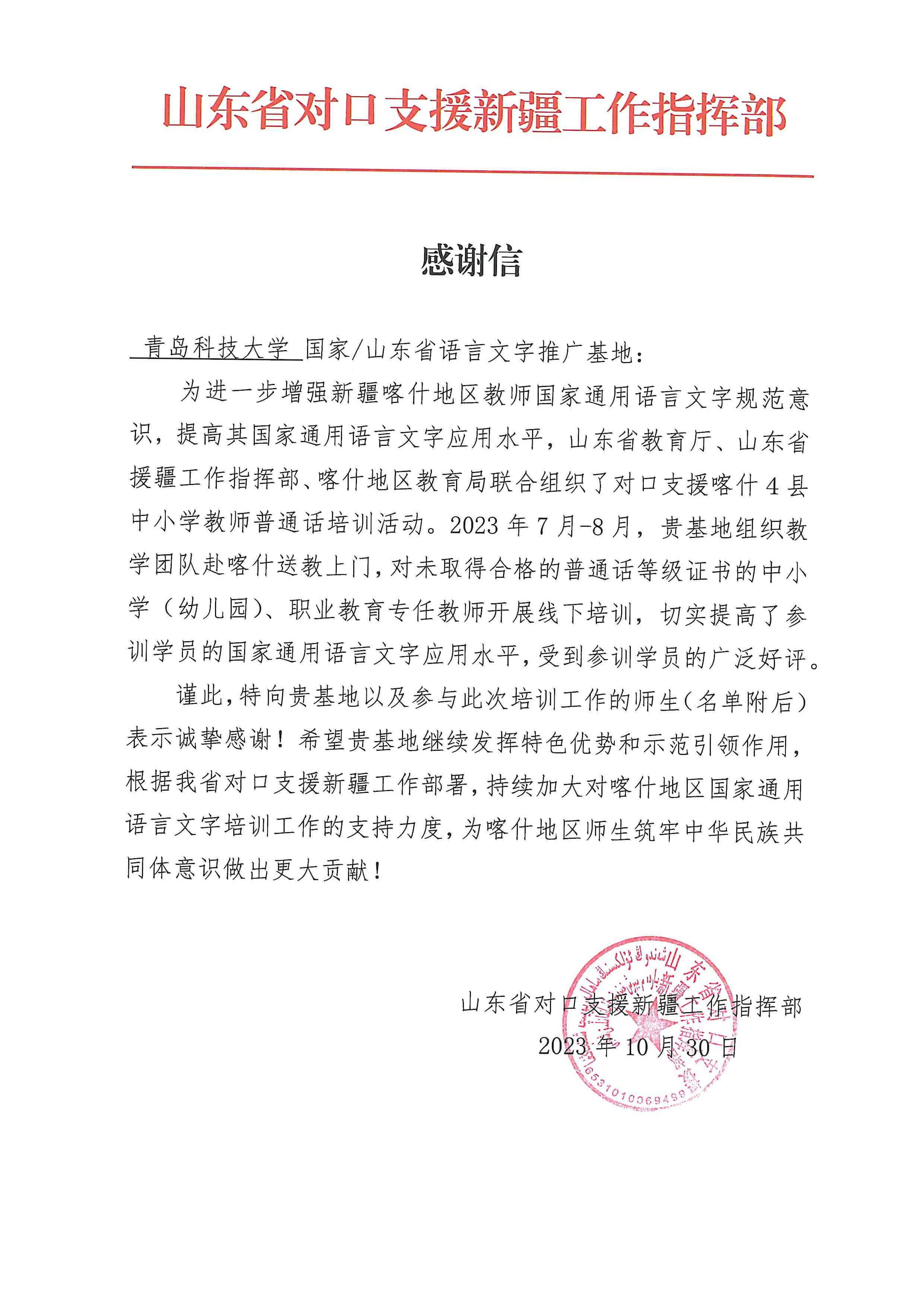 近日,山东省对口支援新疆工作指挥部向学校发来感谢信,向beat365官网参与对口支援喀什地区英吉沙县开展国家通用语言文字培训工作的师生表示诚挚感谢。信中充分肯定了beat365官网语言文字推广基地教学团队在2023年7至8月赴喀什地区送教上门,为新疆喀什地区语言文字的推广作出的积极贡献。信中指出,beat365官方网站培训团为打造普通话对口援疆的“科大品牌”,留下教育援疆“科大印记”,真正做到推普助力乡村振兴,受到参训学员的广泛好评,提升国家语言文化素质,促进语言的全民发展,为新疆教育事业的发展贡献自己的力量。希望beat365官网语言文字推广基地继续发挥特色优势和示范引领作用,根据山东省对口支援新疆工作部署,持续加大对新疆喀什地区语言文字培训工作的支持力度,为喀什地区师生筑牢中华民族共同意识做出更大贡献。