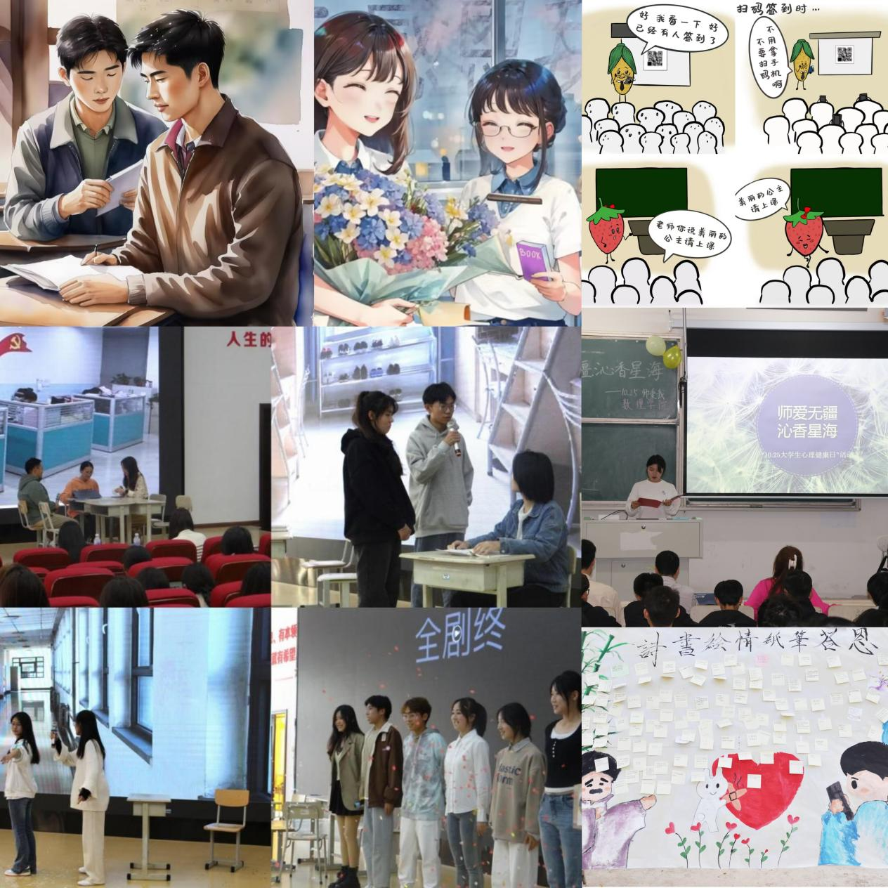 以美润心。经管学院举办“朝沐杏雨,‘剧’念师恩”主题心理剧大赛,同学们以“自己演,演自己”的方式感悟师生之情、诉说成长之路。数理学院邀请优秀班主任殷文明与学生共同参与“师爱无疆,沁香星海”主题活动,让学生在音乐、诗词中体验师生情。信息学院组织同学们将感激之情融入到绘画的每一笔中,有的同学结合专业,利用AI绘画讲述自己与老师的“独家记忆”。自动化学院推出水果系列漫画之师生情,用漫画记录与老师的回忆。化工学院以“笔端生芳华,润物颂师恩”为题,通过对联、绘画、三行诗等形式构建“师生共同体”。