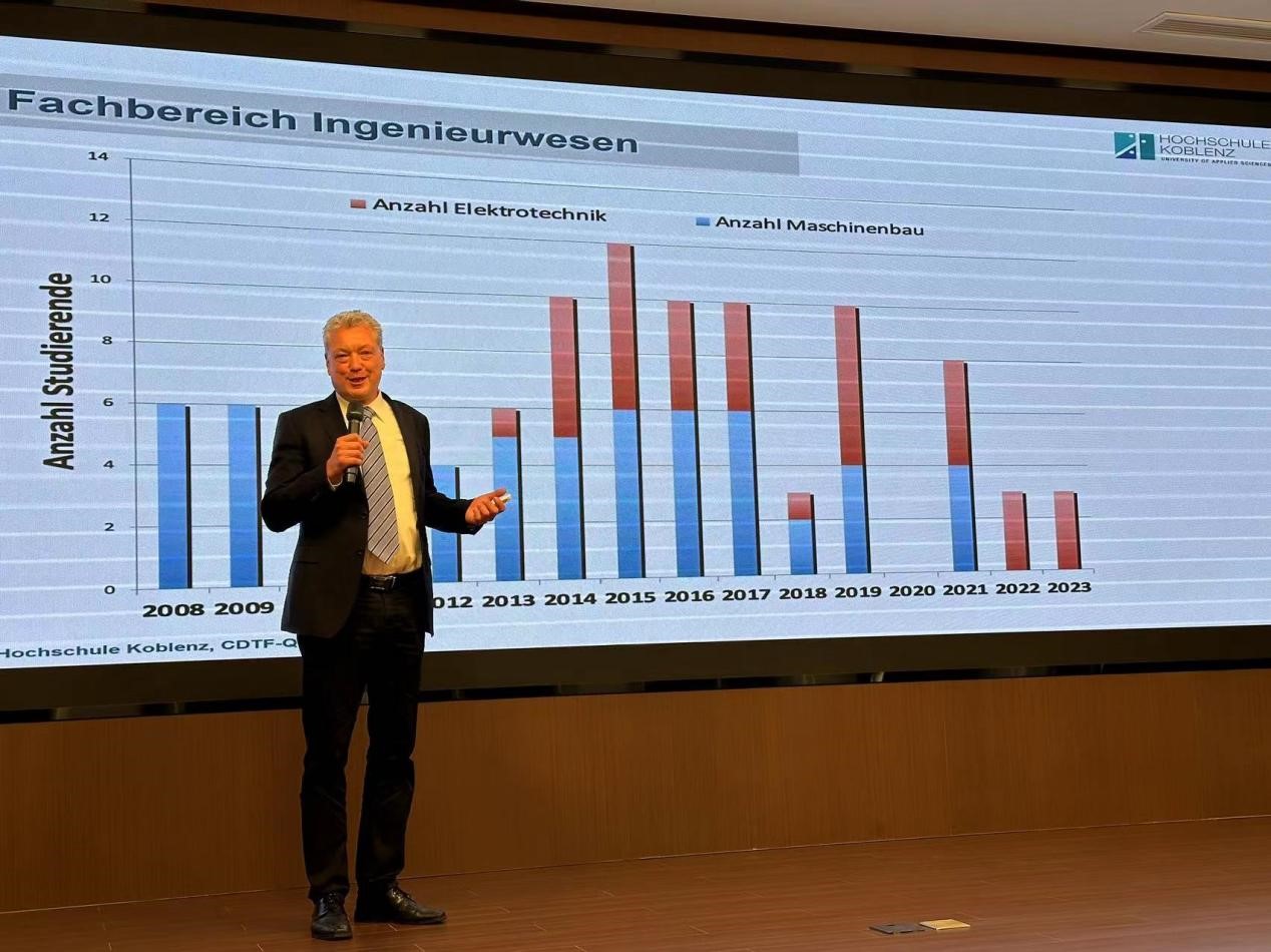 科布伦茨应用科技大学代表潘道夫教授就学校简介、校区分布、专业设置、录取选拔条件及赴德学习模式等进行了详细讲解。他表示,两校自2007年便开展合作,双方交流密切,科布伦茨应用科技大学已培养了近200位来自中德科技学院的优秀学子,绝大多数学生在德继续攻读硕士研究生,在德发展良好。今年学校将为中方学生开设强化语言班、一对一帮助和实习岗位及就业技能培训等,希望能为中德两国社会和工业界培养更多掌握实用技术的专门人才。