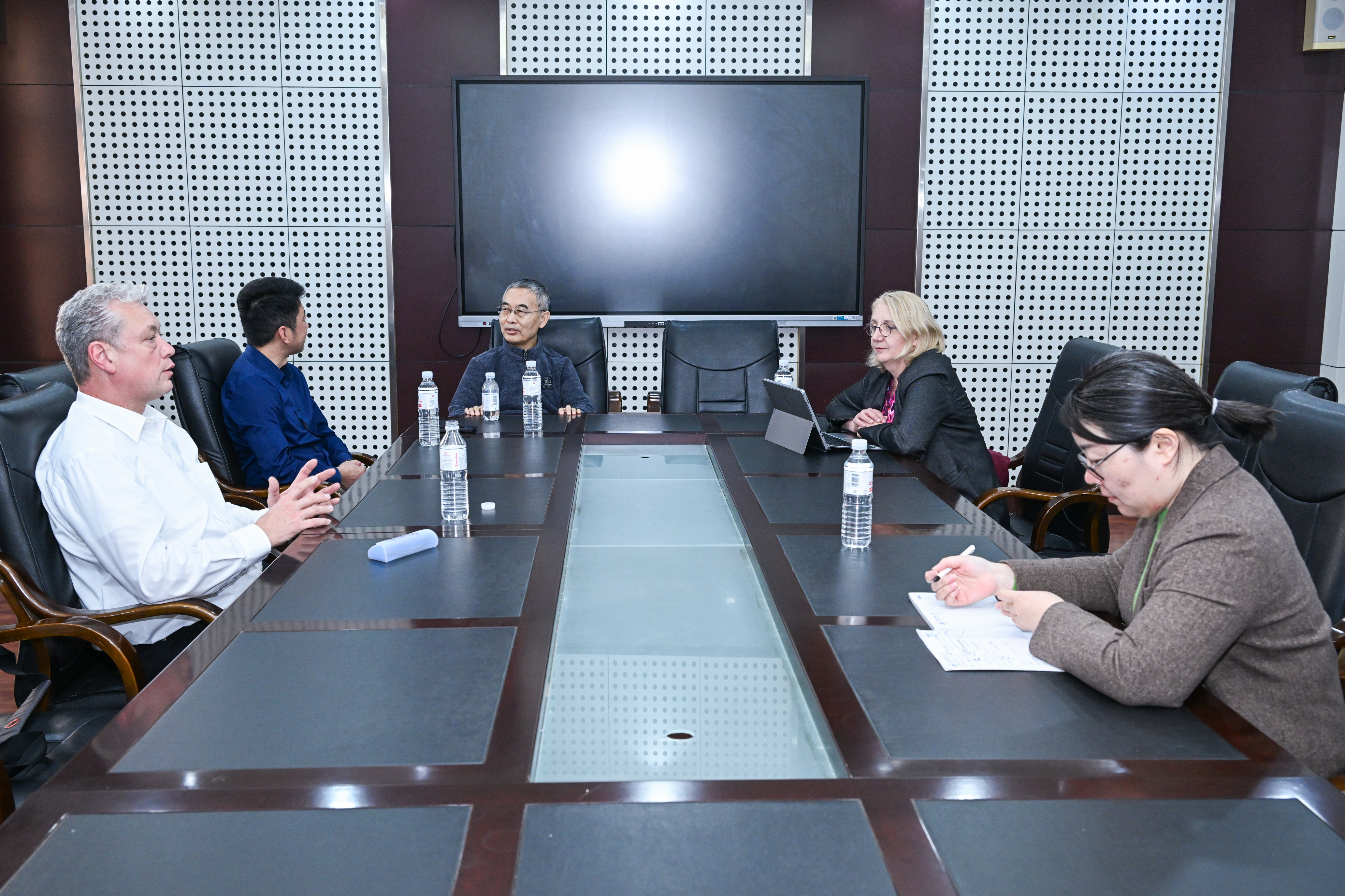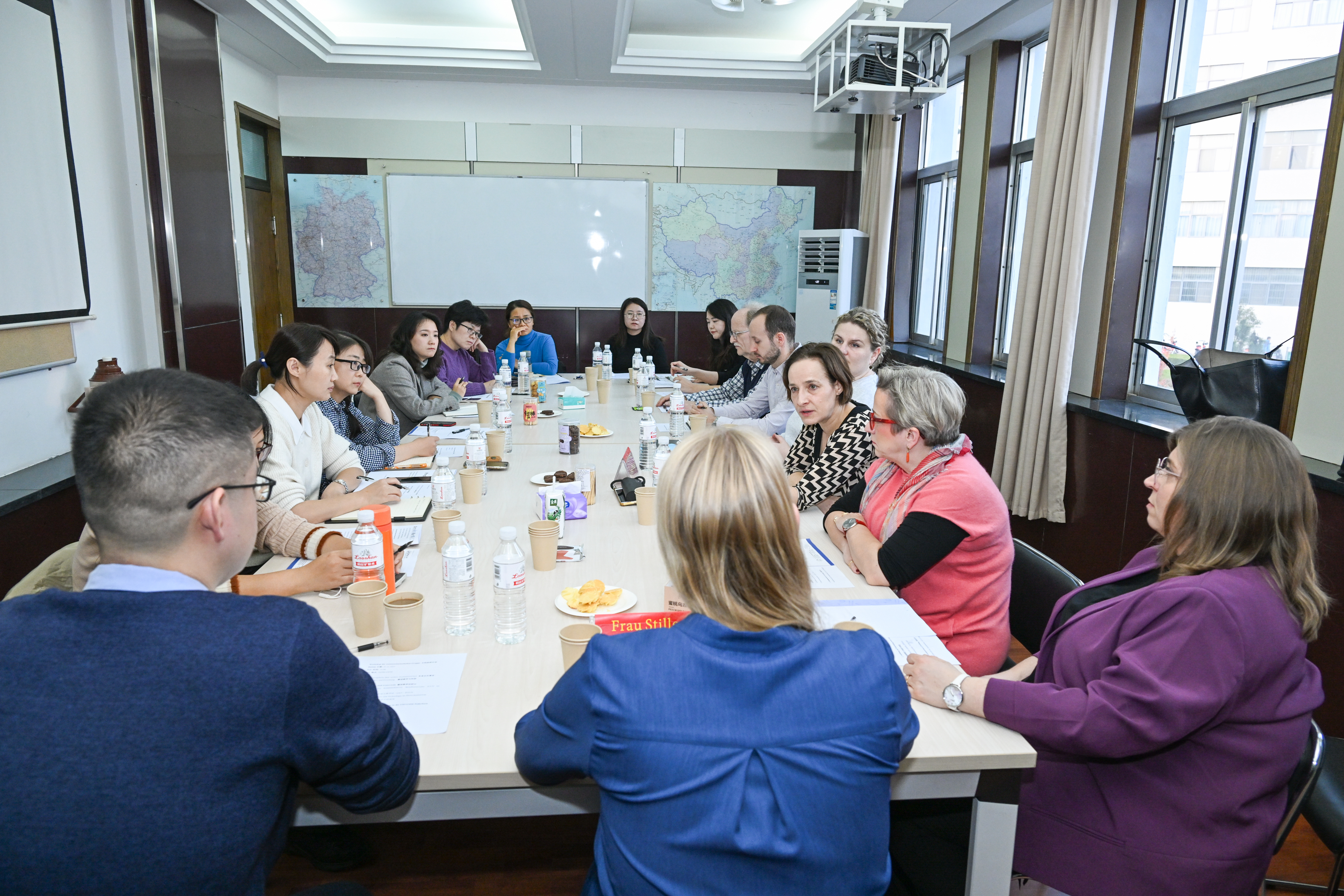文科组在中德科技学院楼A4106召开会议,施蒂勒女士、泽恩教授、巴尔韦格教授、施利姆巴赫女士、伊索女士、弗兰克加德曼教授、阿诺加德曼先生,中德科技学院德语培训中心、中德工程学院德语教学中心相关负责人参加会议。中德双方探讨了沟通式语言教学法(CLT)及多媒体技术在德语课堂中的应用,提出了关于学生选拔录取、分班制度及标准、德语外教聘任等方面的系列建议。此外,双方还对ÖSD考试及德福考试进行了困难解析,研究探讨了其他同等类型考试的可能性。最后,还针对中方教师在德培训及双方科研合作进行了讨论。