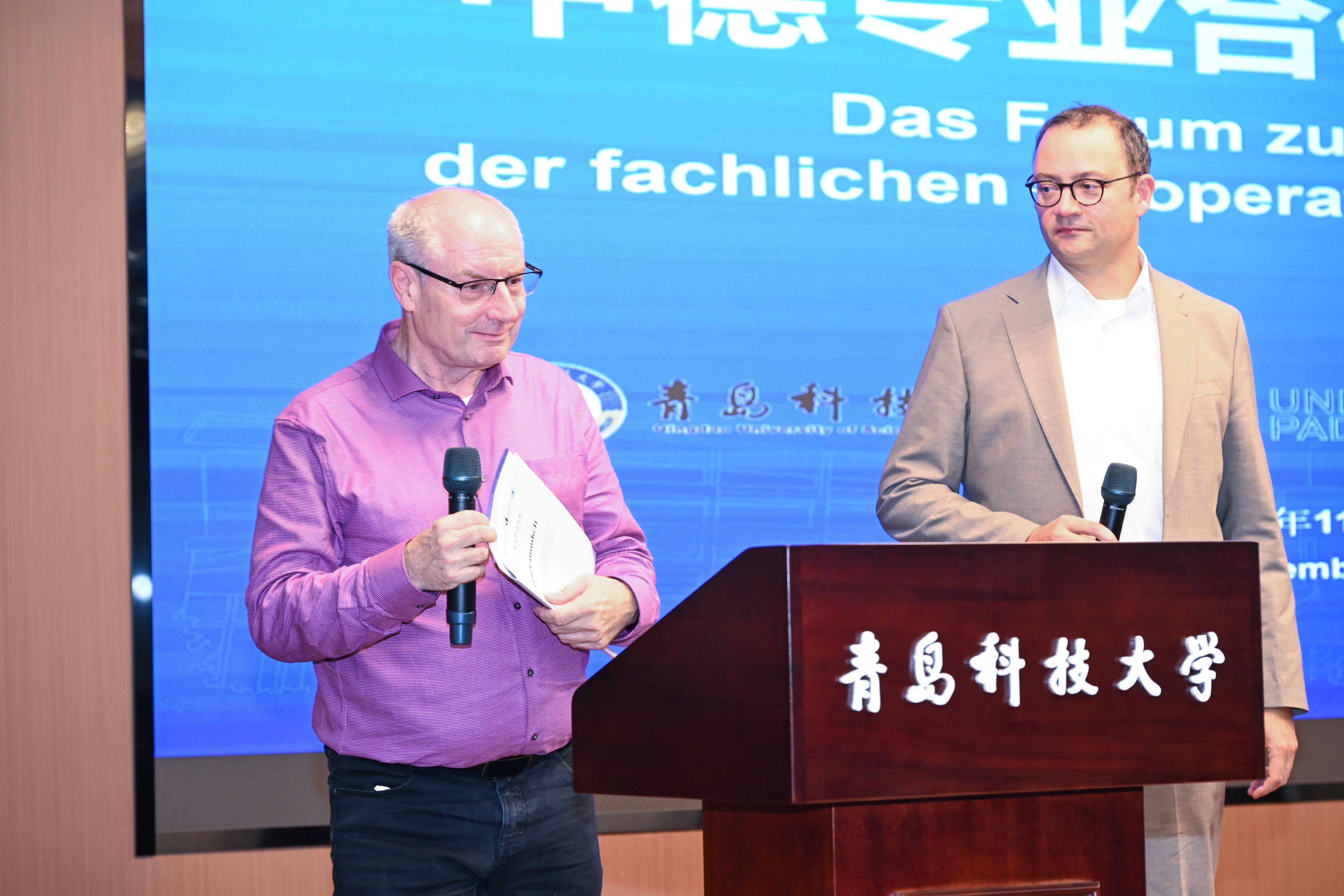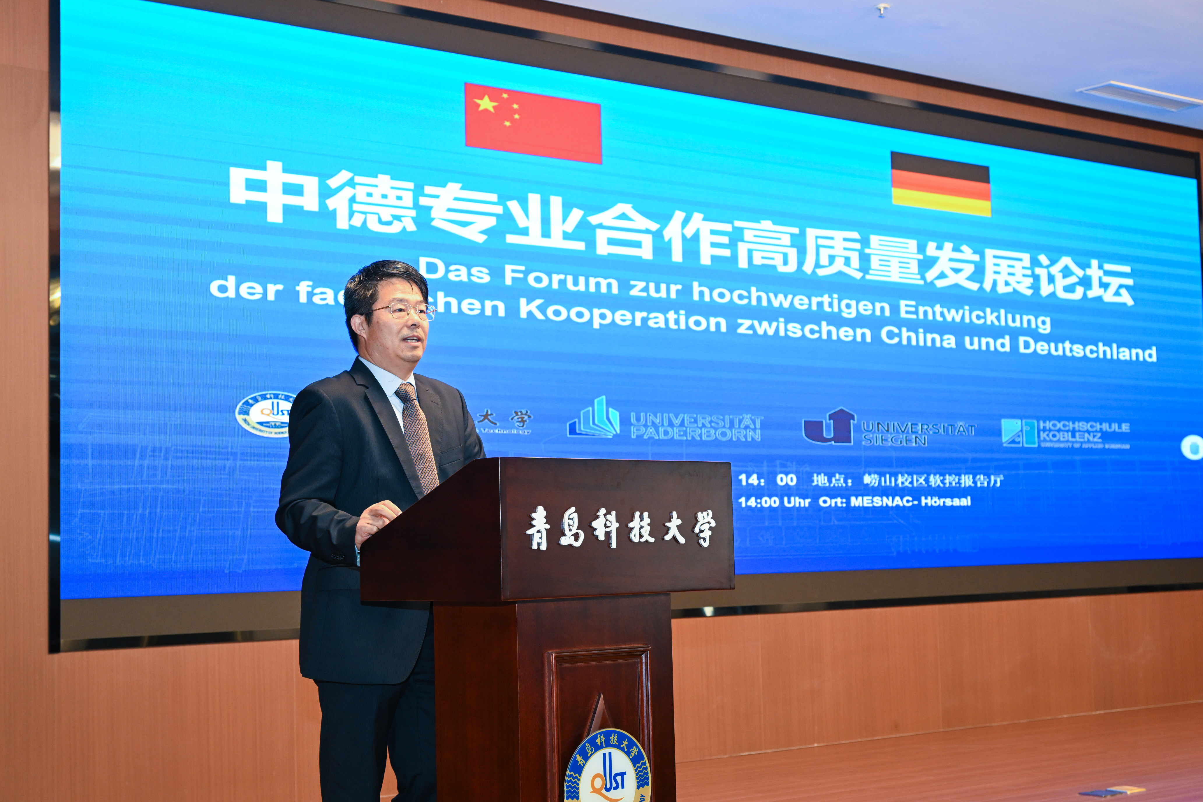 11月21日,beat365官方网站中德科技学院中德专业合作高质量发展论坛在崂山校区召开,帕德博恩大学施蒂勒女士、泽恩教授、策德里克·迈尔教授教授、巴尔韦格教授、邓策博士、科布伦茨应用科技大学潘道夫教授、中德科技学院德方副院长布莱姆泽教授,以及国际处、中德合作办学机构相关负责人出席论坛,中德科技学院院长李庆党主持论坛。