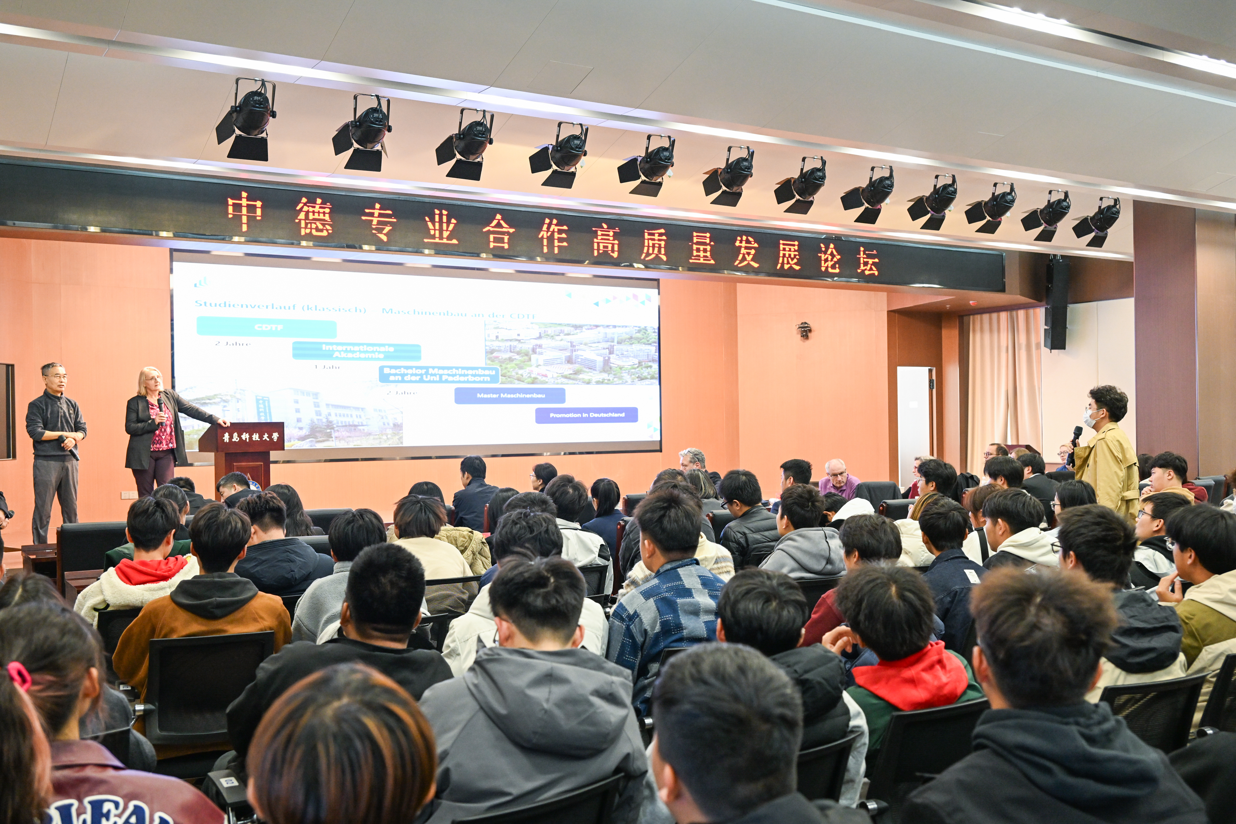 论坛第一阶段,德方高校师生见面会在综合服务楼软控报告厅召开。帕德博恩大学代表邓策博士分别从赴德留学条件、学制安排、专业教学等方面进行了详细介绍,她建议学生们打好语言基础,特别是借助“德语角”活动提升口语并了解德国的学习与生活情况。同时,他表示帕德博恩大学将为中方学生进一步优化课程衔接,将授课内容与学生的知识水平、能力素养相匹配,并提供必要的中文专业辅导以及企业参观实训等多项教辅安排,为中方学生创造更优质的学习环境。