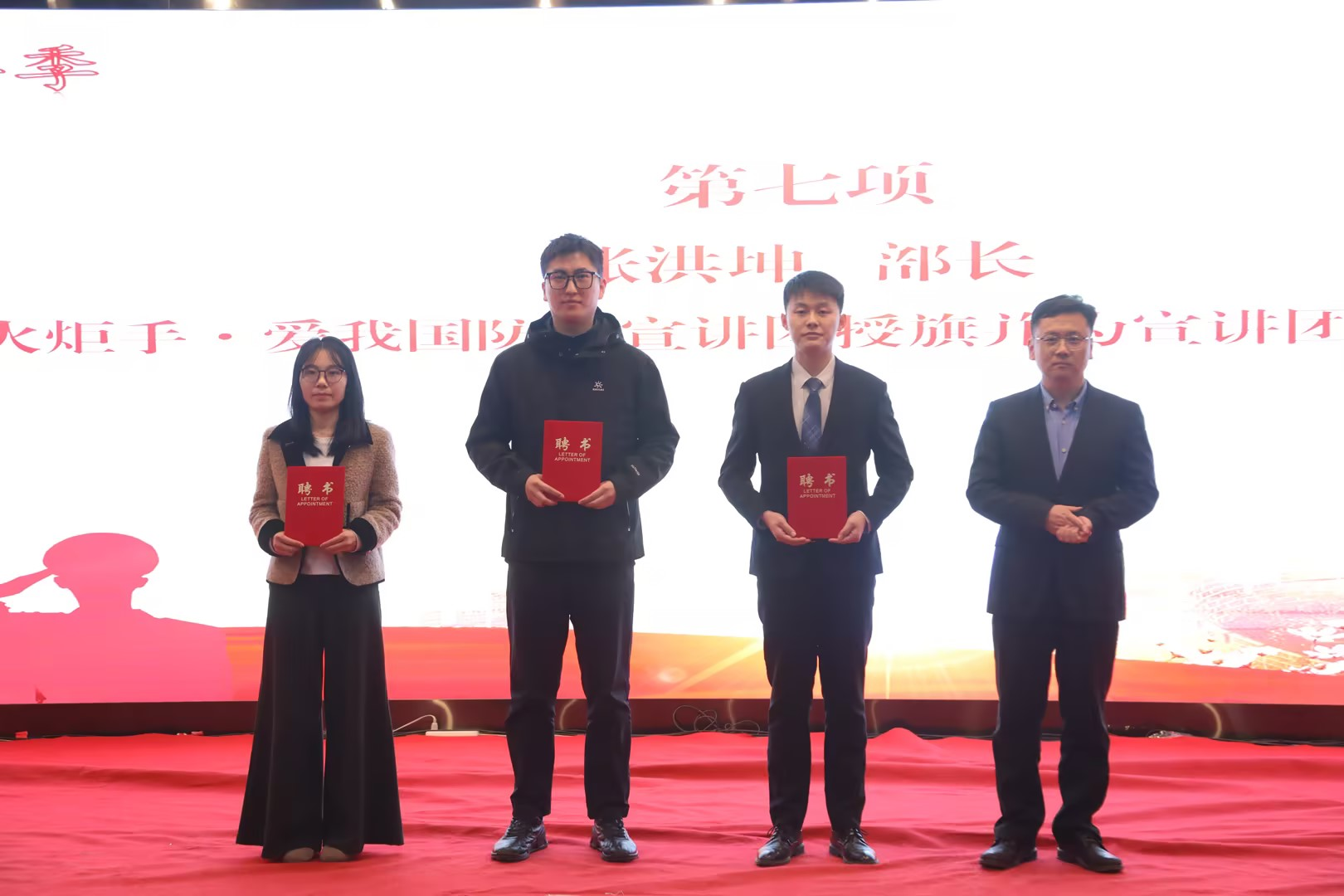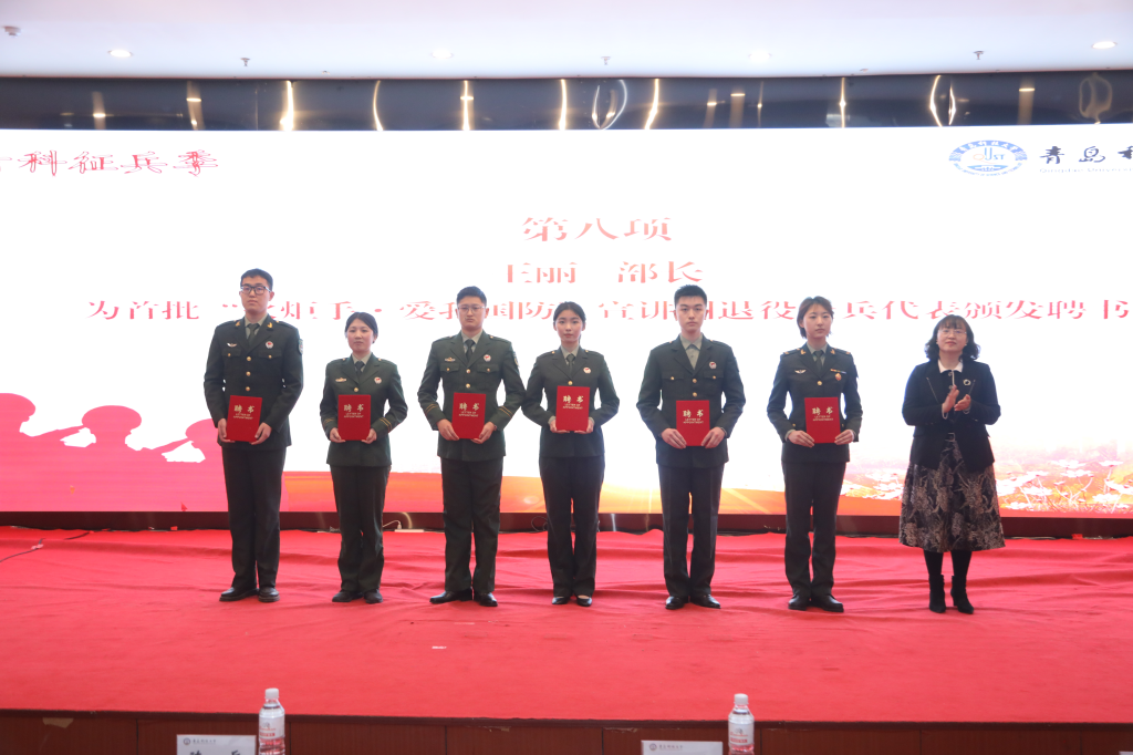 党委学生工作部部长兼武装部部长王丽宣读了《2024年春季应征入伍大学生士兵名单》及相关决定和通知,并为宣讲团退役士兵代表颁发了聘书。