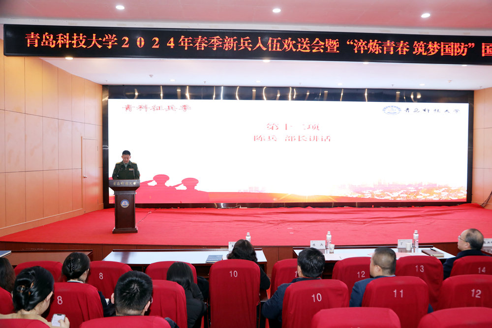 3月14日下午,学校2024年春季参军入伍学生欢送会暨“淬炼青春∙筑梦国防”国防教育文化季启动仪式在崂山校区第三报告厅举行。青岛市市北区征兵办主任、市北区人民武装部部长陈兵,学校党委常委、副校长丁林,党委常委、宣传部长张洪坤出席仪式。
