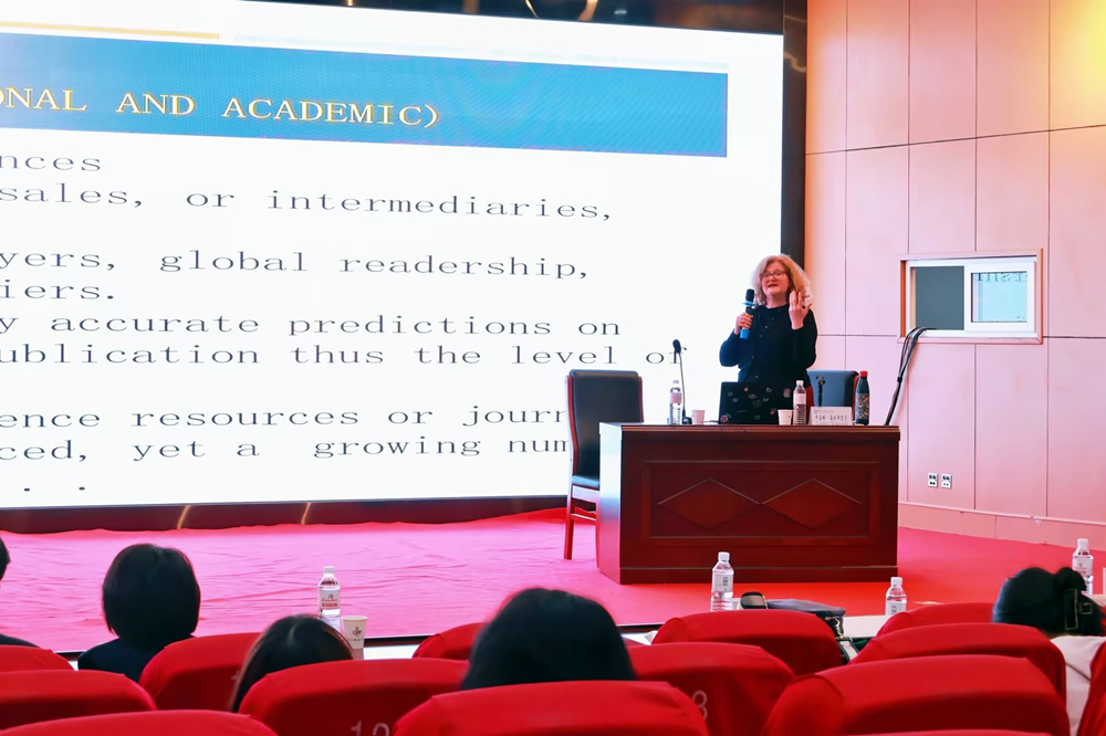 座谈会后,英国斯特灵大学卡洛琳·温特斯吉尔、艾伦·霍普金斯等相关负责人在崂山校区英科(第三)报告厅开展“出版·新媒体·视觉叙事”主题学术交流报告,向传媒学子介绍斯特灵大学,以及相关学术研究情况。传媒学院党委副书记兼副院长刘海波主持会议,传媒学院本科生、研究生代表等100余人参加会议。