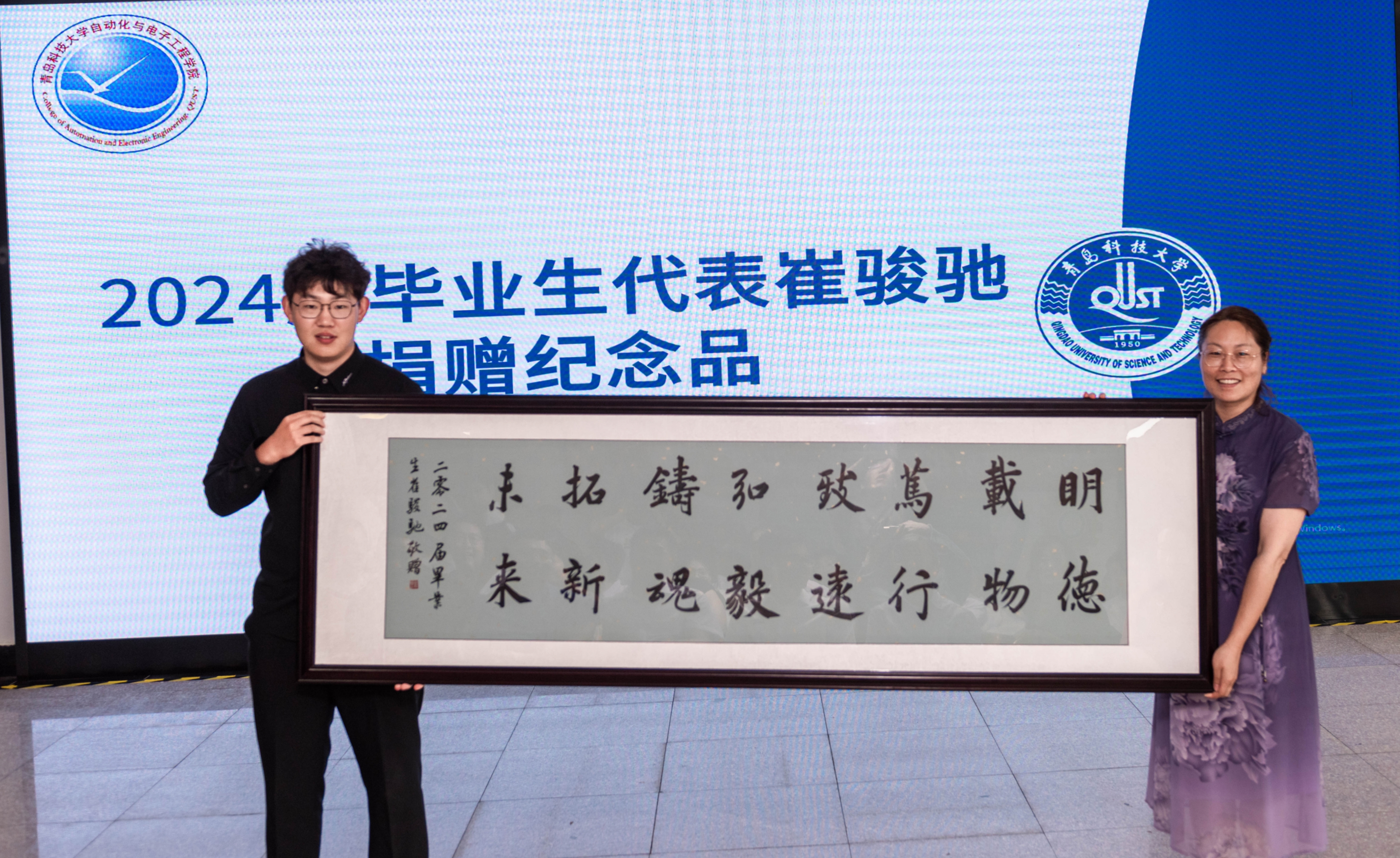 欢送会上,李卉代表学院接受了2024届毕业生代表崔骏驰捐赠的书法纪念品。巩敦卫在致辞中向2024届毕业生送上祝贺与祝福,向在一线教学、后勤保障等育人岗位上默默付出的教职工们表示敬意和诚挚感谢。谭春回顾了38年前在校求学经历,并由“饮水思源”奖助学金的设立初衷谈起寄语全体毕业生心怀感恩、努力奋斗,延续自化校友回馈母校、回馈社会的优良传统。赵雅坤立足“优秀校友”和“创业代表”双重身份,从校园求学到自主创业,分享了自己的创业故事。