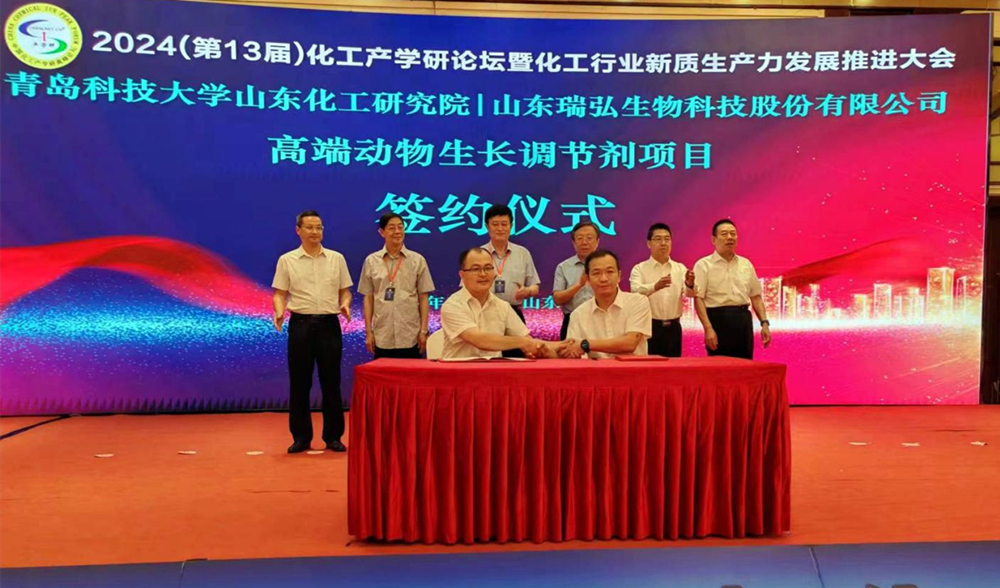 论坛上发布了“2024山东省石油和化学工业创新指数TOP100”,学校山东化工研究院与山东瑞弘生物科技股份有限公司、宁波酶赛生物工程有限公司、山东远联化工股份有限公司就“8-羟基喹啉合成新工艺”“邻氨基苯甲酸系列产品新工艺和螯合剂合成新工艺”“高端动物生长调节剂”签订了产学研合作协议,签约金额达5500万元。