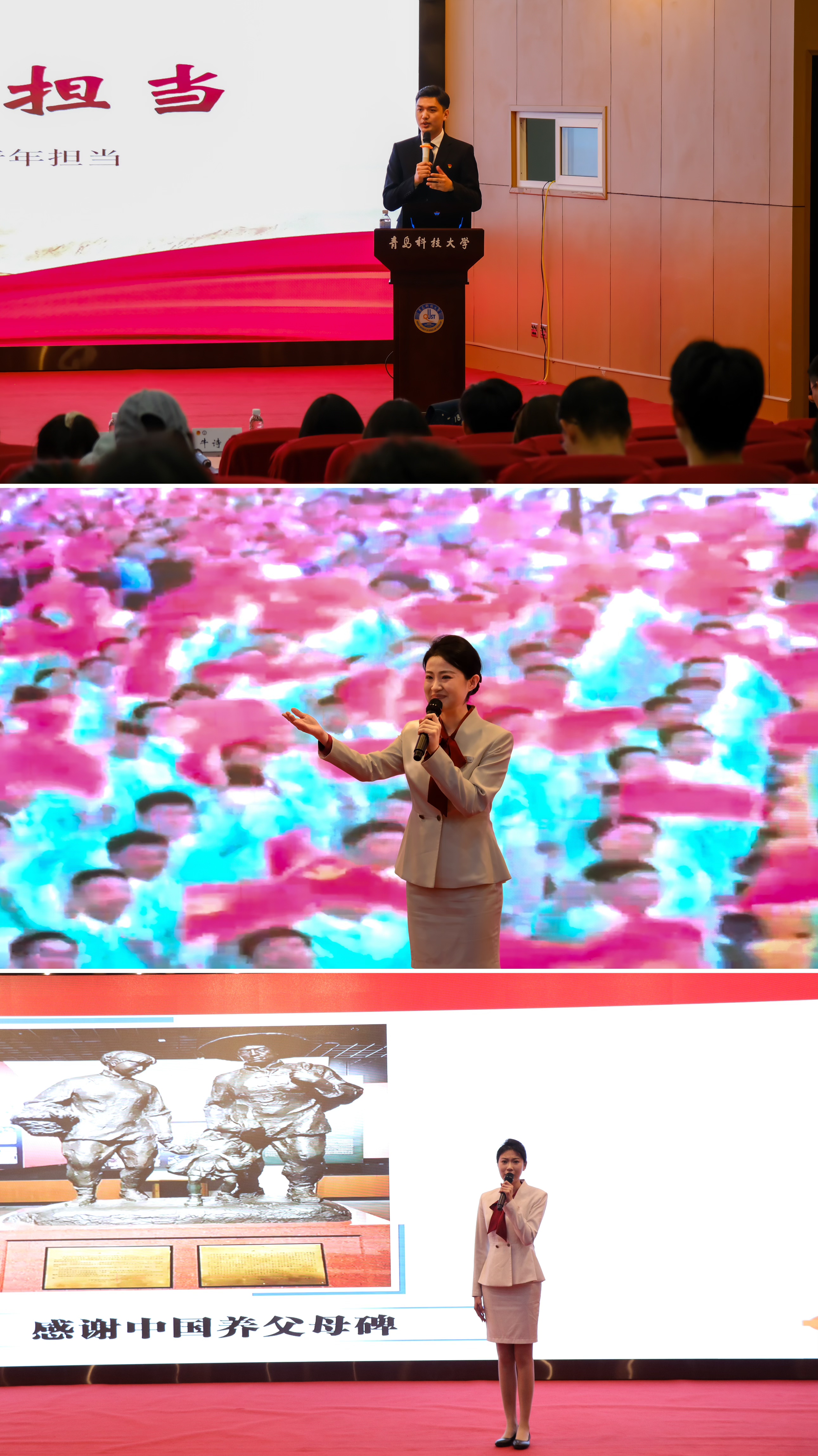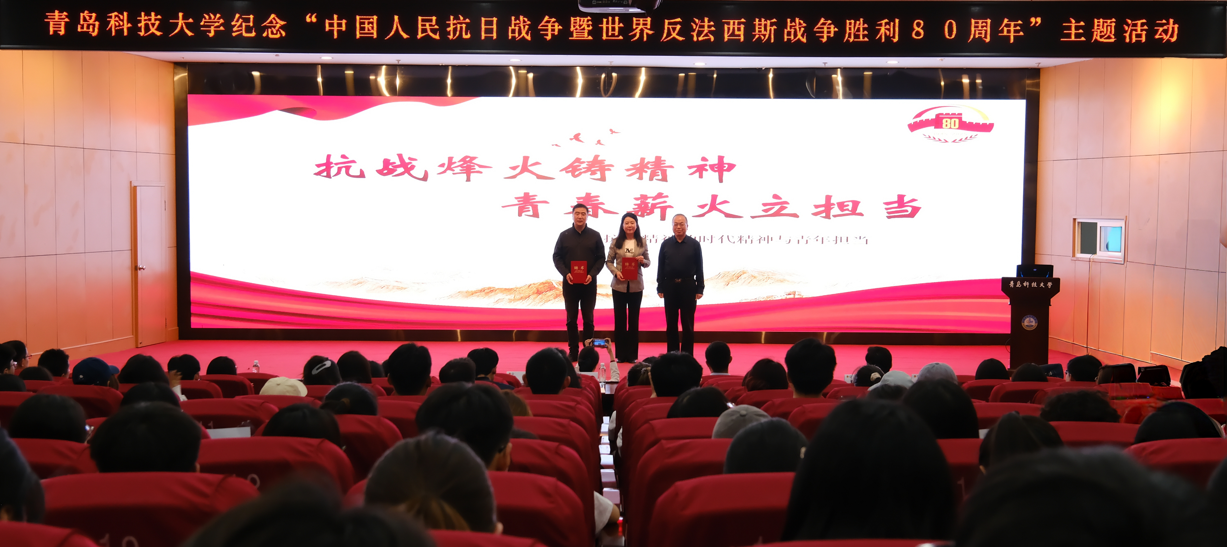 5月21日,学校纪念中国人民抗日战争暨世界反法西斯战争胜利80周年红色精神主题宣讲活动在崂山校区英科报告厅举行。沈阳“九·一八”历史博物馆副馆长魏鹏,社教部主任石任华,学校党委常委、副校长丁林出席活动。