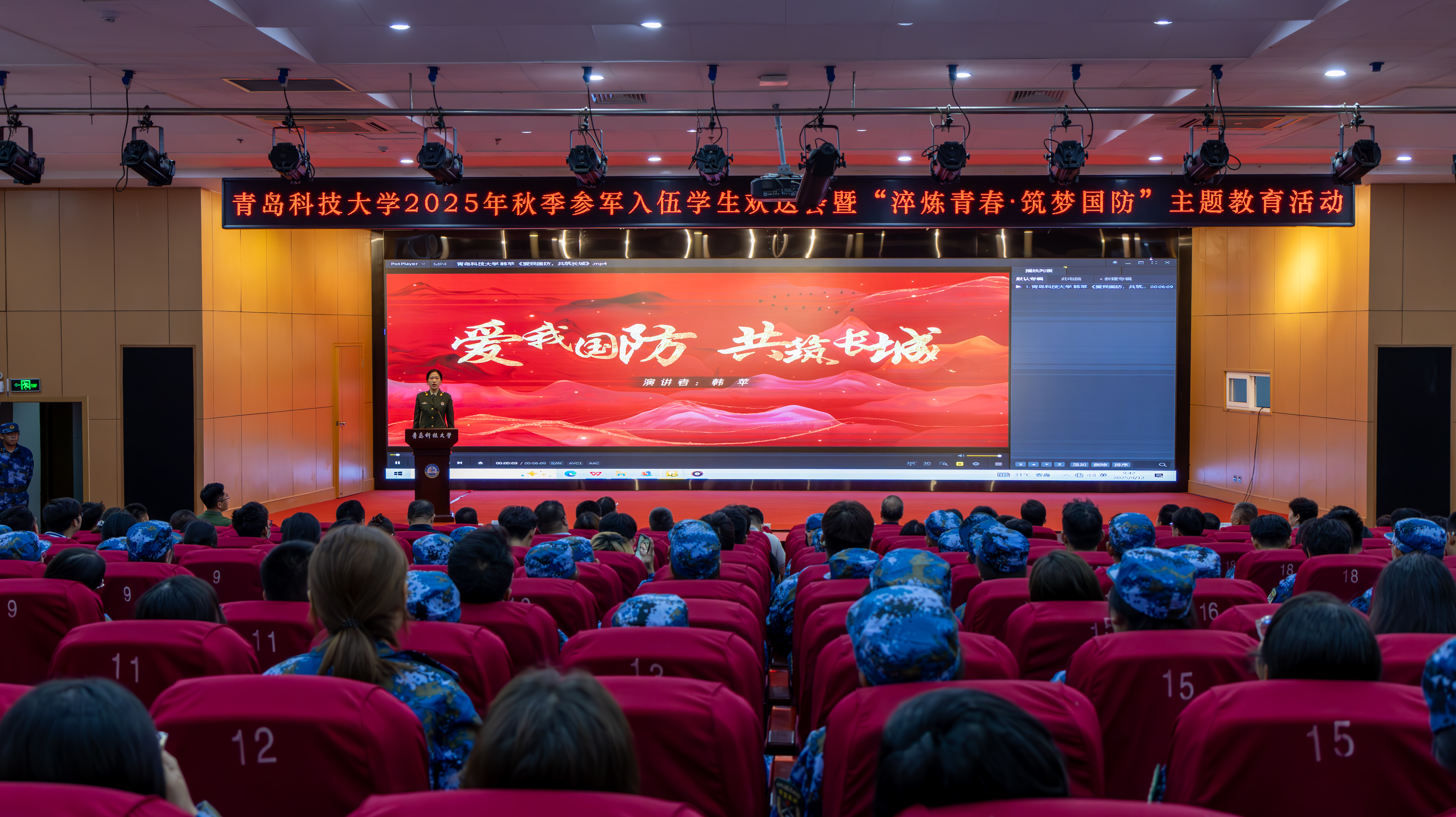 9月12日,学校2025年秋季参军入伍学生欢送会暨“淬炼青春·筑梦国防”主题教育活动在崂山校区英科报告厅举行。青岛市市北区委常委、市北区征兵办主任、市北区武装部部长陈兵,学校党委常委、副校长丁林,党委常委、党委宣传部部长张洪坤,青岛市国防体育运动协会秘书长刘传辉等出席仪式。