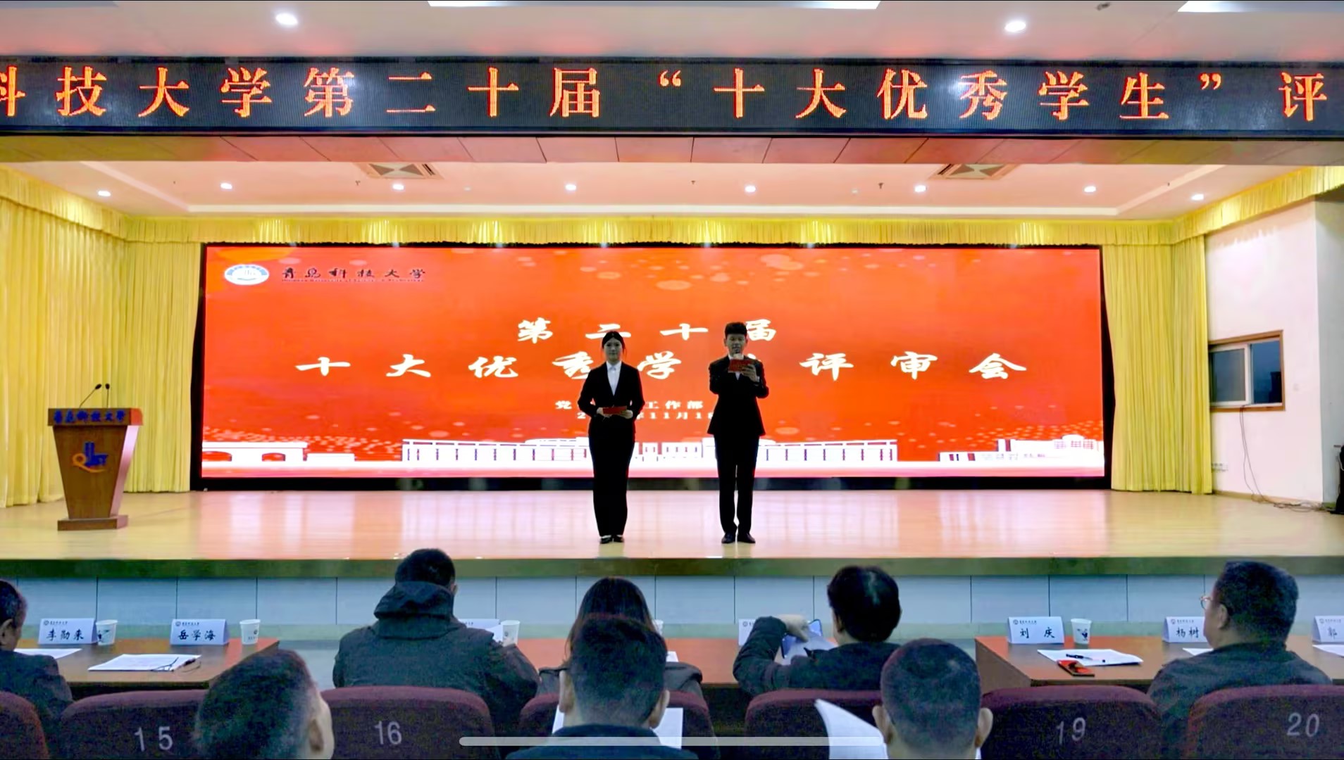 11月18日下午,学校第二十届“十大优秀学生”评审会在崂山校区第二报告厅举行。由各学院(校区)书记、院长代表,学生工作委员会成员,教师代表及学生代表组成的评审团参加现场评审,四方校区、高密校区、中德工程学院设立分会场同步收看直播。