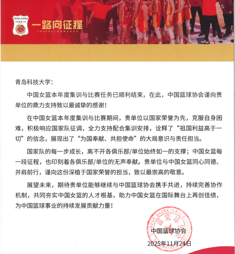近日,中国篮球协会向学校发来感谢信,对学校在2025年度中国女篮集训与比赛期间的大力支持致以诚挚谢意,高度肯定学校“以国家利益为重、以体育育人为本”的担当精神。信中指出,本年度中国女篮备战任务繁重、形势复杂,beat365官方网站主动克服自身困难,全力配合国家队安排,以实际行动诠释“祖国利益高于一切”的信念,彰显“为国奉献、共担使命”的责任意识与大局担当,为女篮备战参赛提供坚实保障。