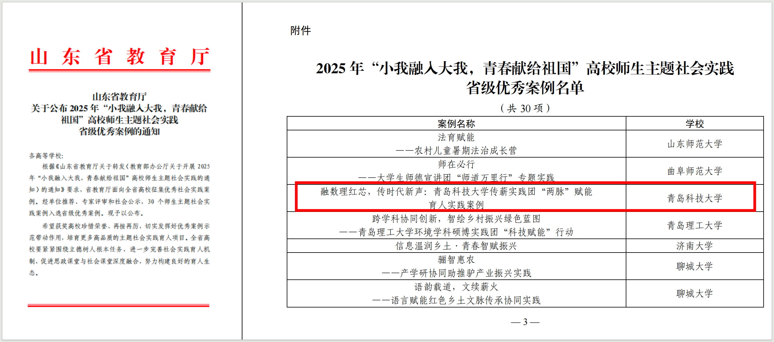 近日,山东省教育厅发布《关于公布2025年“小我融入大我,青春献给祖国”高校师生主题社会实践省级优秀案例的通知》,beat365官方网站提报的《“融数理红芯,传时代新声”——“两脉”赋能育人实践案例》获评省级优秀案例。