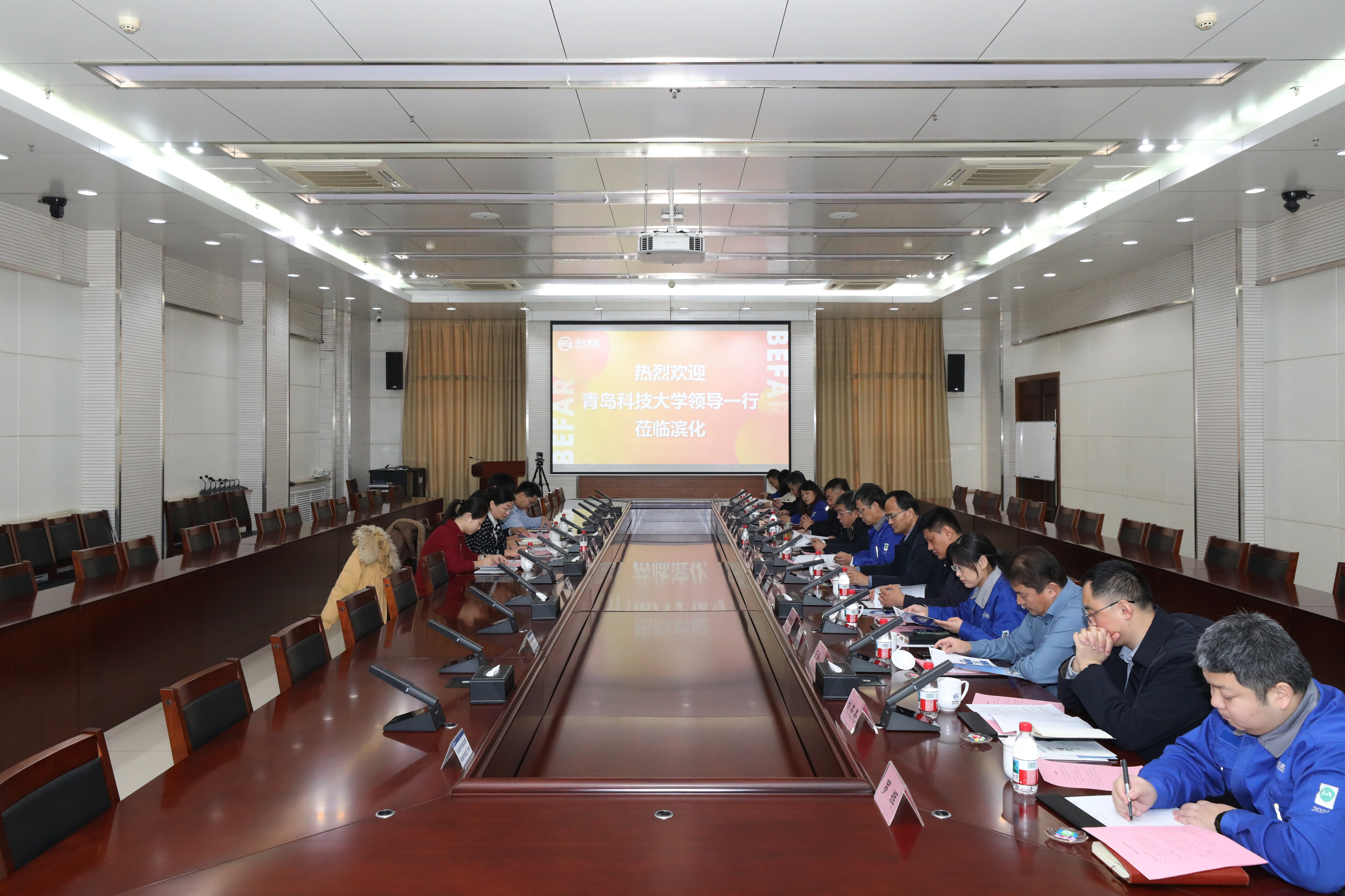 1月27日上午,王震一行在滨州市人社局党组书记、局长田洪刚,市公共就业和人才服务中心党总支书记、主任颜波,滨城区委常委、副区长张磊,滨化集团副董事长刘洪安的陪同下,到滨州和滨化集团调研走访交流。王震一行在滨化集团举行了座谈会,田洪刚致欢迎辞,详细介绍了滨州市产业布局、经济社会发展现状及人才引进政策。王震对滨州人社部门在毕业生岗位提供、人才政策支持、政校合作方面表示感谢,表示学校将以此次调研交流为纽带,进一步优化人才培养方案,强化实践教学环节,为滨州产业发展输送更多高素质应用型人才。刘洪安就滨化集团产业发展布局、人才招聘需求、学校在企毕业生工作情况进行了介绍。座谈会前,王震一行参观调研了滨化集团展厅,详细了解了滨化集团发展历程、核心技术、产业布局及未来规划,直观感受了企业的创新活力与发展潜力,为后续深化校企合作奠定了更坚实的基础。