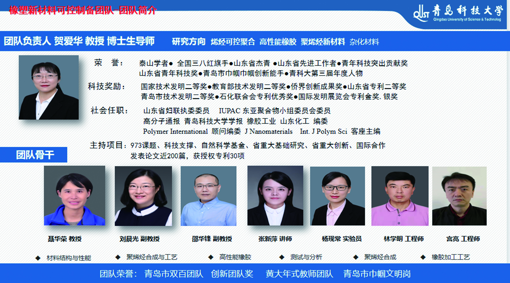 贺爱华教授带领团队,瞄准合成橡胶领域前沿,不断思考基础科学问题,积极拓展研究思路,不断学习跨学科跨专业知识,尝试建立涵盖催化机理、聚合工艺、聚合物结构与性能、聚合反应工程、应用及制品等全链条研究模式。她首次提出了齐格勒-纳塔催化剂催化二烯烃聚合的机理,明晰了合成橡胶的级分分布与链结构,阐明了反式丁戊橡胶的贡献机制,提出了橡胶高性能化的策略,开发了全新的反式丁戊橡胶系列新材料,自主设计开发先进的聚合工艺与装备,实现原创性橡胶TBIR的产业化。