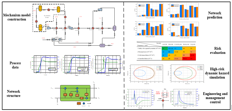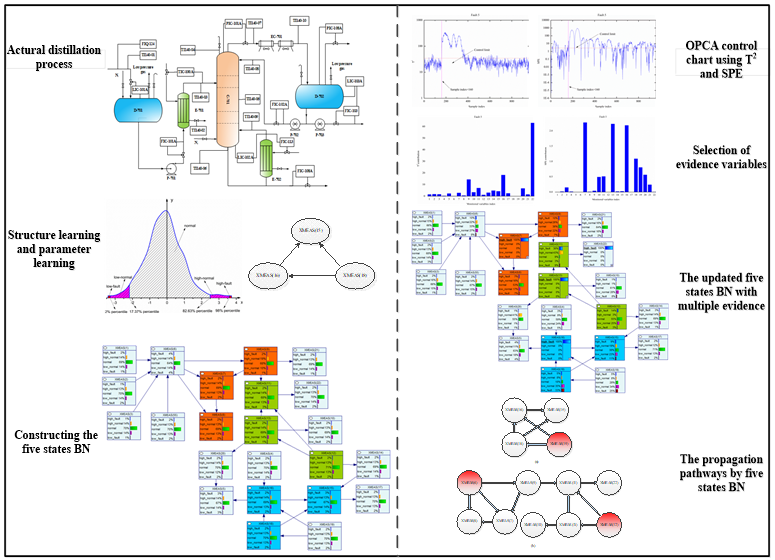 其中,文章“An intelligent quantitative risk assessment method for ammonia synthesis process”针对动态化工过程潜在风险难以预测的情况提出了一种智能的定量风险评估方法(如图1),通过深度学习技术捕捉工艺变量的深层特征,评估工况的风险等级,最终制定控制方案,保证工艺的安全运行。文章“Optimized principal component analysis and multi-state Bayesian network integrated method for chemical process monitoring and variable state prediction”针对化工企业异常工况根原因追溯困难的实际难题,提出了一种先进的过程监控方法(如图2),通过改进PCA以及构建新型多状态贝叶斯网络,做到全面的故障传播路径分析,保障化工企业的安全生产以及异常工况的提早处置。两篇文章均以beat365官方网站为第一单位,化工学院田文德教授为论文的通讯作者,博士研究生刘子健、硕士研究生柳楠分别为两篇论文的第一作者,实验室老师刘彬、李传坤、崔哲参与指导工作。