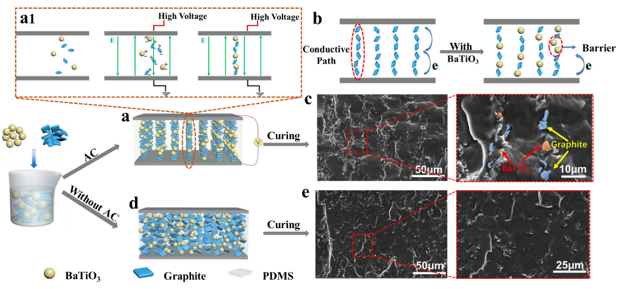 图1.取向与未取向三相复合材料的制备过程示意图,(a)交流电场下三相复合材料的自组装过程示意图,(a1)取向排列的形成机理示意图,(b)三相取向的机理示意图,(d)未取向三相复合材料的示意图,(c)和(e)取向与未取向三相复合材料的扫描电镜图。