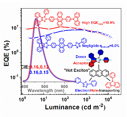 有机电致发光二极管(OLED)作为新一代信息显示技术的生力军,在高端显示领域已展现出巨大的应用前景。而目前制约OLED发展的关键因素之一是综合性能优异的蓝光材料的缺乏。尽管蓝色磷光材料,热活化延迟荧光材料,在器件效率上已经实现了很大突破,但是在纯蓝有机荧光材料开发上,还面临很大挑战,而且器件的稳定性与实际的工业应用仍有较大差距。因此,发展集高效率、低效率滚降、高色纯度等优异的综合性能一体的纯有机蓝光材料与OLED器件仍具有很大挑战。