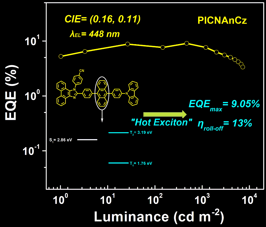 近期,青科大高分子学院山东省高校青创人才引育计划团队负责人薛善锋教授在综合性能优异的纯有机蓝光材料与OLED器件方面取得最新进展,团队成员首先通过设计合成了基于蒽为共轭桥,氰基取代菲并咪唑为受体,N-苯基咔唑为给体的纯有机蓝光分子(PICNAnCz),制备并优化了基于该分子为发光层的非掺杂OLED器件,展现出最大电致发射峰位为448 nm,色坐标CIE为(0.16, 0.11)、最大外量子效率达9.05%,且效率滚降只有13%,相应的激子利用率近87%的非掺杂纯有机蓝光OLED器件,实现了高效率、低效率滚降、高色纯度的非掺杂纯有机蓝光OLED器件,是目前文献报道的同类非掺杂蓝光OLED器件中综合性能最好结果。结合光谱学、理论模拟及磁场效应实验相结合,这一结果主要是归因于从高能三线态激子T2到单线态激子S1纳秒尺度的反向系间穿越所致,形成了三线态激子利用的热激子通道。相关工作以“High external quantum efficiency and low efficiency roll-off achieved simultaneously in nondoped pure-blue organic light-emitting diodes based on a hot-exciton fluorescent material”为题发表在Elsevier学术期刊《Chemical Engineering Journal》上(Chemical Engineering Journal,2021, 408, 127333.IF=13.273,中科院一区TOP期刊),beat365官方网站为第一单位和唯一通讯单位,薛善锋教授为独立通讯作者。高分子学院硕士生吕显浩和许雷为共同第一作者。