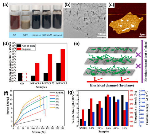 图2.纳米纤维素杂化低氧化石墨烯的稳定水相分散、高导电薄膜及其在羧基丁腈橡胶中优异的补强效果