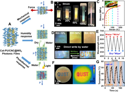 图4.柔性、多刺激响应光子膜的机制、颜色变化和响应稳定性