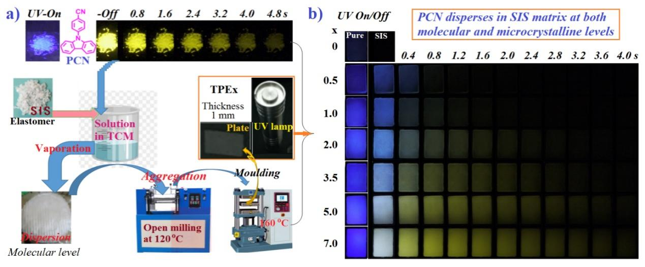 目前,国际著名研究团队已尝试将咔唑衍生物和刚性极性的聚甲基丙烯酸甲酯进行溶液成膜,但均未获得值得关注的分子分散态RTP性质,并以此现象解释所获得的晶体RTP起源和机理。本团队基于对咔唑衍生物本征磷光性质的研究和高分子物理和材料加工基础知识的深入理解,通过溶液成膜和随后热塑化及成型手段,首次发现即使结构简单的咔唑衍生物掺杂到非极性弹性的苯乙烯-异戊二烯-苯乙烯三嵌段共聚物(SIS)中,也能获得优良的RTP性质。这一结果刷新了人们现有的认知,并首次揭示非极性弹性体的内聚力也能有效抑制三线态热失活,从而挑战了现有RTP机理和强化机制。该项研究还首次实现了动态延迟光色可变的分子态和微晶态双RTP发射。