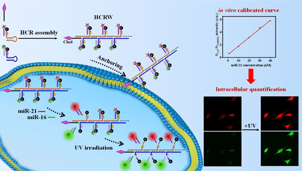 miRNA参与了细胞增殖、分化和凋亡等重要的生理过程。异常的miRNA表达与某些疾病的发生和发展密切有关,如恶性肿瘤。因此,准确监测细胞内miRNA水平对基础生物学研究和疾病诊断具有重要意义。目前发展的RT-PCR、Northern印迹和微阵列筛选等方法虽然已在细胞裂解液实现了miRNA的检测,但无法适用于活细胞中的原位检测。荧光成像技术具有原位成像、可视化、分辨率高和无创性等优势。然而,传统的荧光传感体系受到信号输出不稳定、探针递送效率低等影响,鲜少能够实现的细胞内定量。