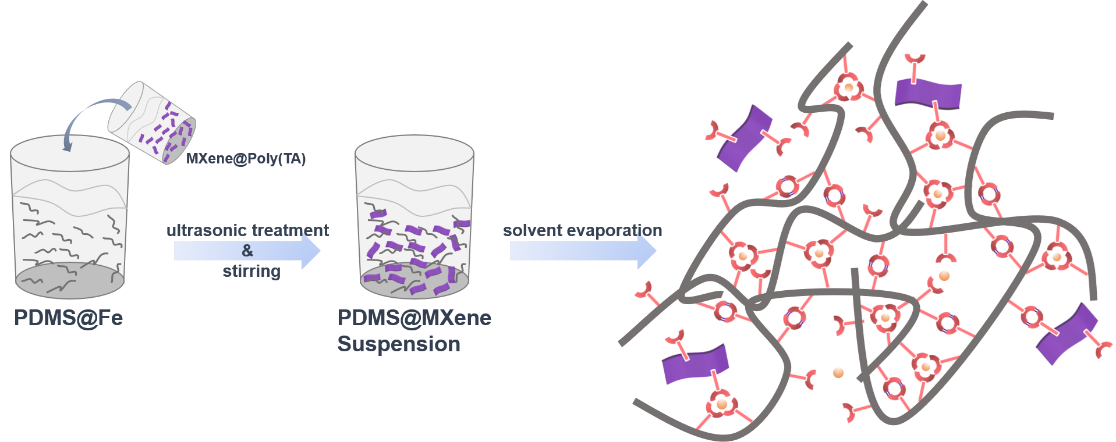 此外,创新性地利用含硫五元环的开环聚合(ROP)赋予有机硅超分子和MXene末端羧基结构,通过金属离子和氢键作用进行交联,使MXene巧妙地嵌入有机硅超分子中,从而制备具有良好导电性和优异传感能力的有机硅弹性体,体系中由于同时存在氢键和金属-配体键的可逆相互作用,材料可在无外界刺激的情况下自主修复,效率高达91.7%,在运动监控、软机器人等领域具有很大的应用价值。该工作以“Modified MXene-Doped Conductive Organosilicon Elastomer with High-Stretchable, Toughness, and Self-Healable for Strain Sensors”为题发表于期刊《Composite Structures》(Composite Structures, 2022, 282:115071. IF= 5.407,中科院一区TOP期刊)上。