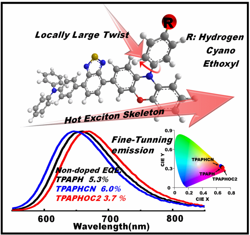 团队成员围绕有机发光分子激发态性质这一核心科学问题,在有机电致红色荧光材料与OLED器件方面取得新进展。团队提出了利用局部大扭曲构象设计具有微调激发态特征的红光分子体系的策略。团队选择了一个基于热激子机理设计的红光分子骨架,在不改变分子骨架的情况下通过对分子骨架上与给体吩噁嗪单元相连的苯环进行修饰,获得了TPAPH、TPAPHOC2和TPAPHCN三个深红光发射分子。由于三个分子都存在独立于分子骨架之外的局部大扭曲构象,因此可以实现修饰基团对分子激发态影响的最小化。最终三个分子在理论模拟和实验测试中均表现出了相近的激发态特征。基于TPAPH、TPAPHOC2和TPAPHCN制备的OLED器件的电致发光峰位分别为660、669和647 nm,CIE坐标分别为(0.68, 0.32),(0.69, 0.31)和(0.66, 0.34),均属于深红光发射范围。其中基于TPAPHCN制备的OLED器件外量子效率达到了6.0%,为目前外量子效率最高的非掺杂红光热激子器件。该成果为调控分子激发态特征、设计荧光分子体系提供了一种可行策略。局部大扭曲构象设计荧光分子体系的思想具有简便、易实现的优势,可以在保证荧光分子光色相近的情况下充分挖掘分子骨架的潜力。这种设计理念为未来有机荧光材料体系的扩展提供了一个很好的思路,同时也展示出其在OLED应用领域的巨大价值。