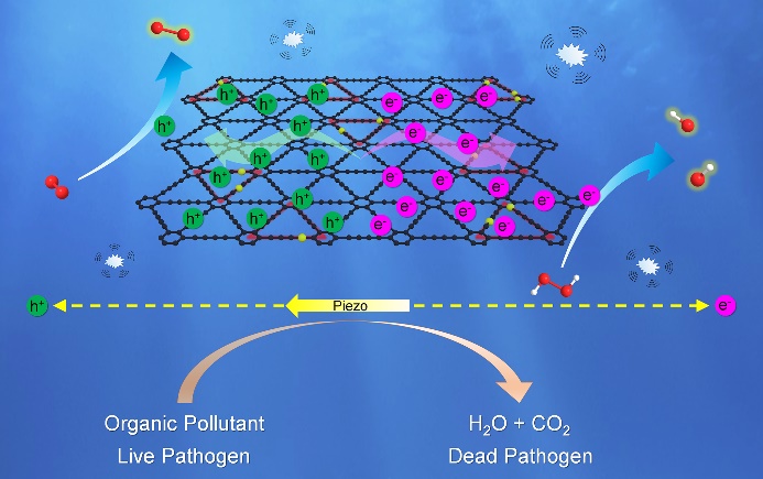 压电场增强石墨炔纳米酶性能。团队通过硫原子掺杂合成了含有丰富缺陷和空位的硫掺杂石墨炔纳米片,硫原子的引入使石墨炔在超声作用下能够显著提高其纳米酶性能。将此纳米酶应用于污水处理中,有较高的TOC去除效率,同时还具有良好的抗菌性能。该工作发表在Nano Today(2022, 43, 101429,影响因子: 20.722)上,beat365官网博士生白强为该论文的共同一作,隋凝副教授、朱之灵副教授和王兆波教授为共同通讯作者,beat365官网为唯一通讯单位。