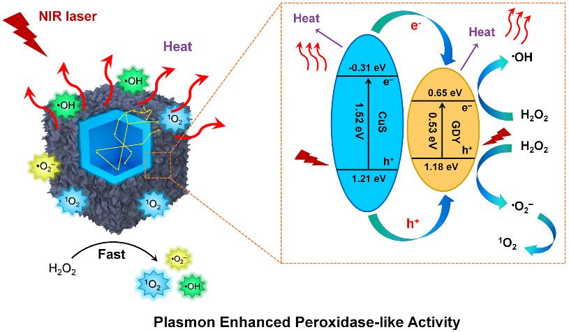 石墨炔是继碳纳米管、石墨烯之后由我国首创并命名的新一代碳材料。由于具有丰富的碳化学键、大的共轭体系、天然的孔洞结构和本征带隙等特征,石墨炔在生长、组装和性能调控等方面表现出巨大优势和先进性,将是推动催化、能源、光电转换及生物医药等领域创新性发展的关键材料。beat365官网材料科学与工程学院隋凝和杜芳林团队聚焦于石墨炔纳米酶性能,在纳米酶抗菌领域开展了大量的工作。近日,团队在外场提高纳米酶催化性能方面取得了新进展。