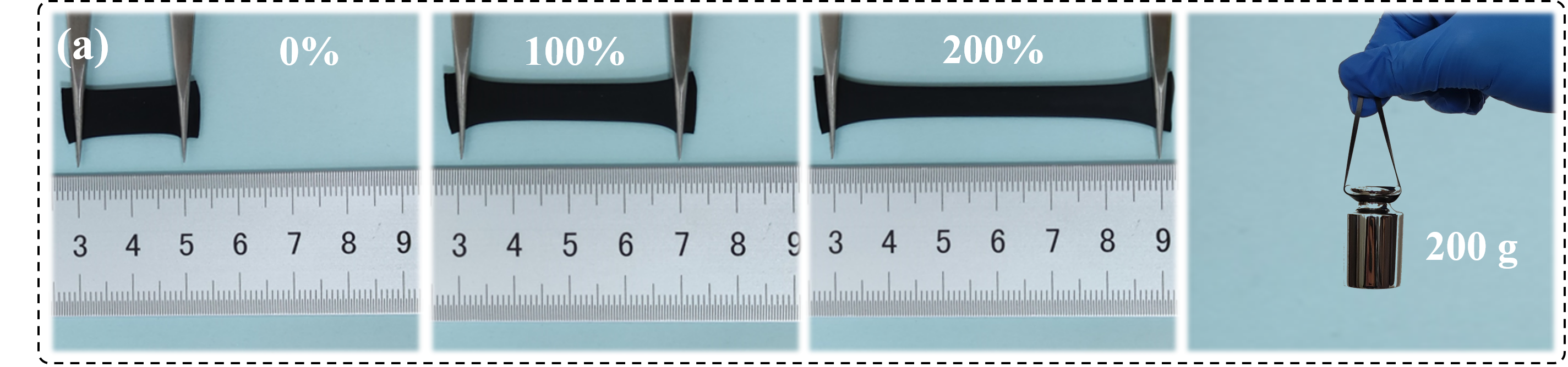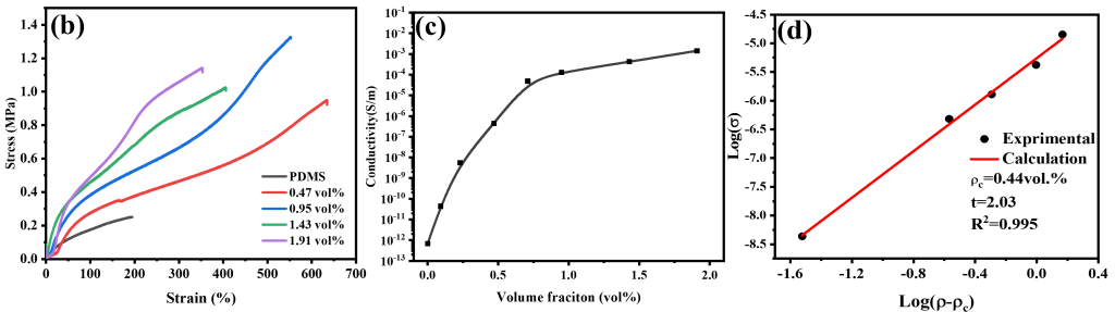 图2. (a) rGO/PDMS薄膜在拉伸应变为0%、100%、200%和负载200g重量下的数码照片;(b) PDMS和rGO/PDMS薄膜的应力-应变曲线;(c) rGO/PDMS薄膜的电导率与rGO负载的关系曲线;(d)电导率与ρ-ρc的对数图。