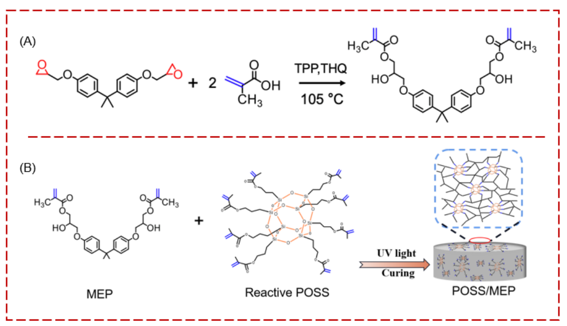 图1.POSS/MEP树脂复合材料制备,(A)端接甲基丙烯酸酯双酚A环氧树脂(MEP)的合成,(B)POSS/MEP复合材料UV固化过程。