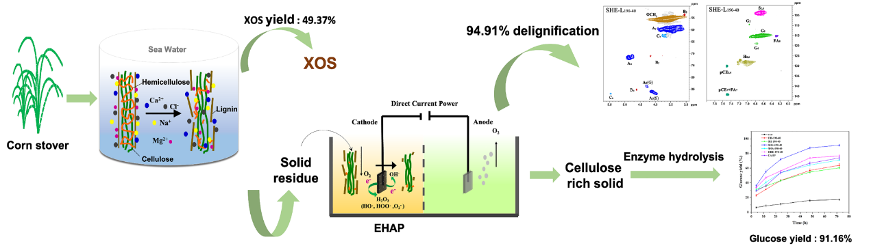 在此基础上,该团队提出了一种新颖的海水水热-电催化两步预处理技术,基于半纤维素优先策略实现了秸秆全组分的精准拆解与高效转化,同时制备低聚糖、可发酵性糖和小分子量木质素化合物,并揭示了主要组分的降解转化机制。相关研究成果以“Promising seawater hydrothermal combining electro-assisted pretreatment for corn stover valorization within a biorefinery concept”为题目,发表在生物质领域国际知名期刊Bioresource Technology (Bioresource Technol.2022, 351:127066. IF= 11.889,中科院一区TOP期刊)。论文第一作者为海洋学院硕士研究生吴越,通讯作者为吉喆副教授,beat365官方网站为第一单位和唯一通讯单位。该项工作得到了国家自然科学基金、山东省重大创新工程的资助。